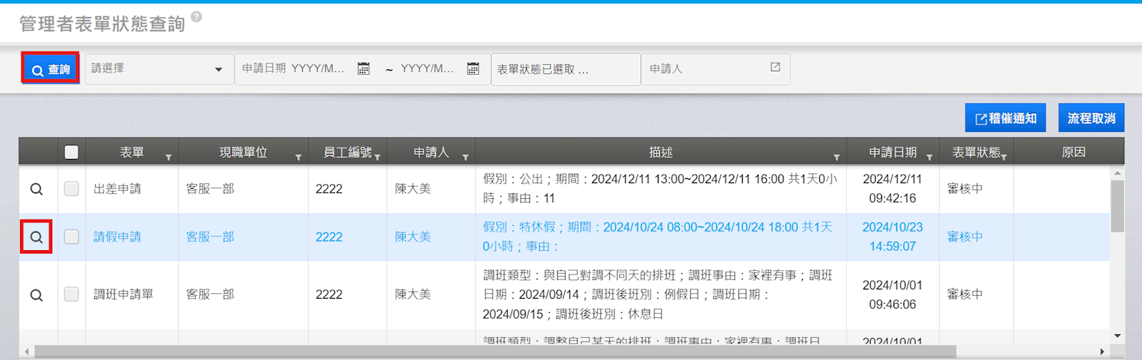 2. 點選【查詢】可看到所有表單,請點選放大鏡進入查看表單狀態。
