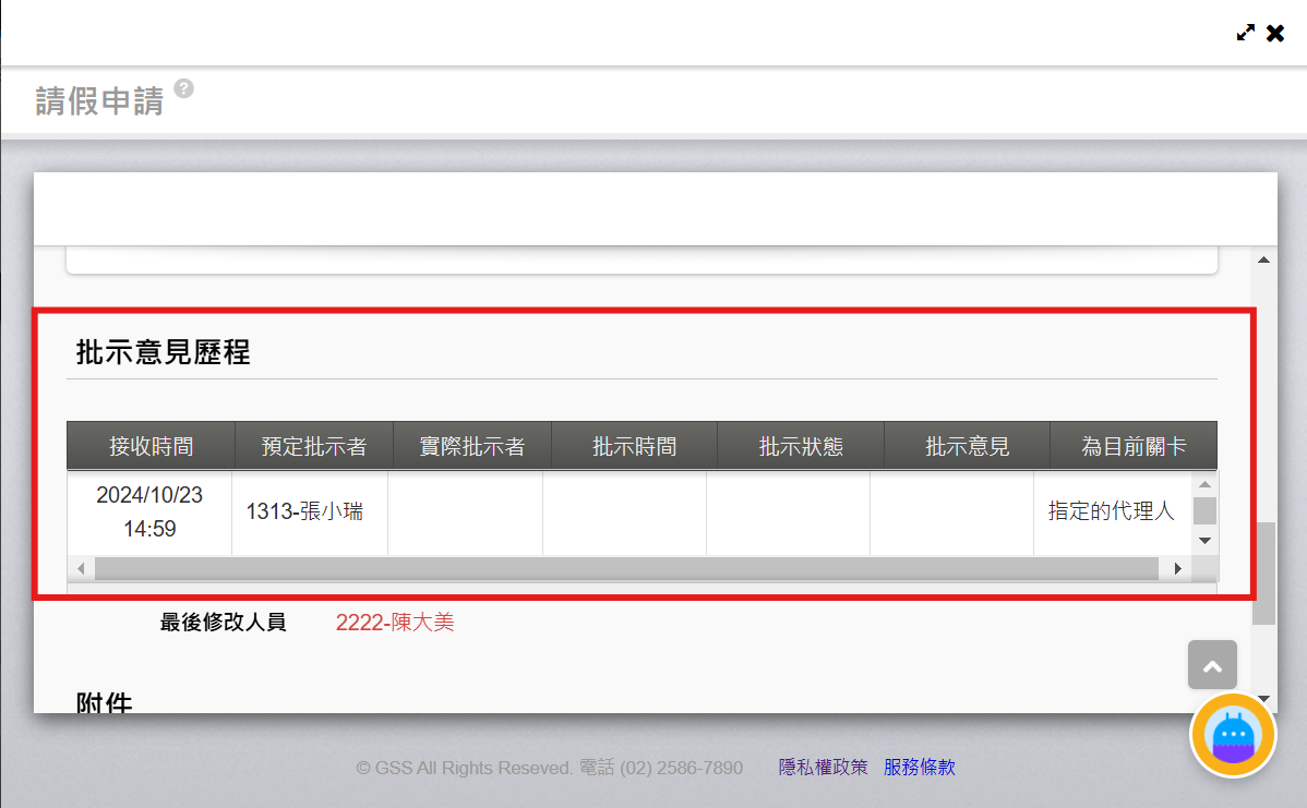 3. 下拉至最下方區塊即可查看【批示意見歷程】,這裡會列出每一個簽核的日期和時間。