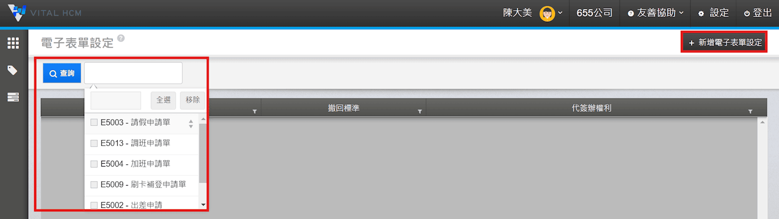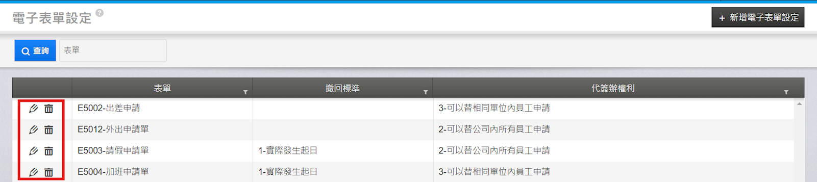 2. 搜尋框可幫助快速查找電子表單設定,或直接點選查詢可看到所有電子表單設定,點選右上角【新增電子表單設定】。