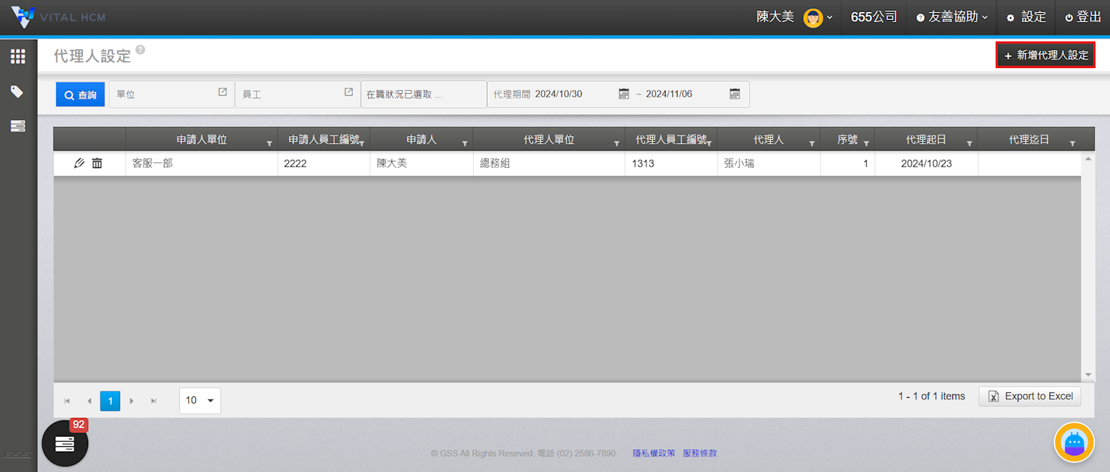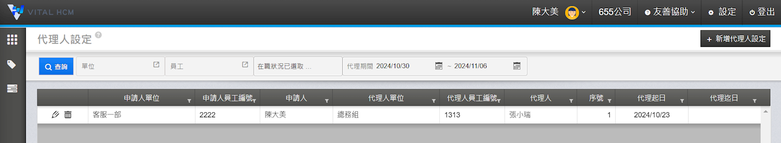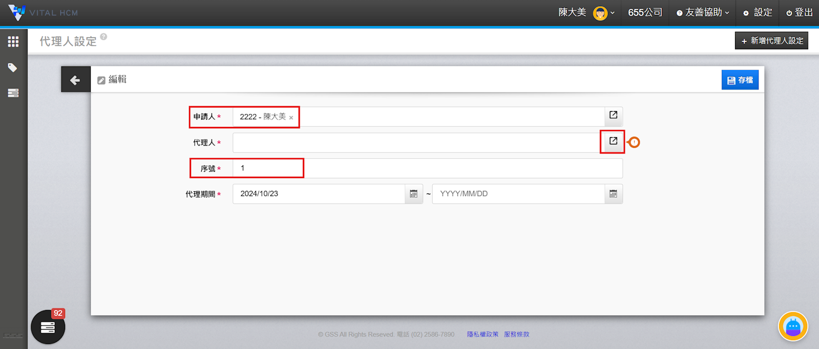 3. 請輸入申請人(被代理人)、代理人、序號(一位員工可新增多位代理人,可設定代理人排序)、代理期間後按【存檔】。