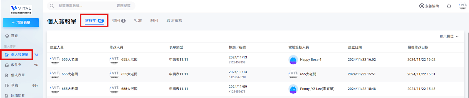 1. 請至【個人簽報單】>【審核中】 找到要編輯/補件的表單。