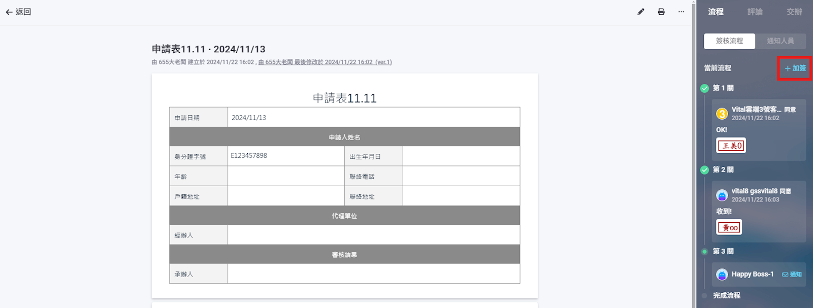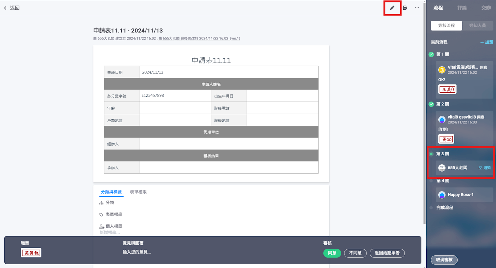 4. 可看到起單者已被新增到流程中,並且可點選右上角鉛筆進行編輯/補件。