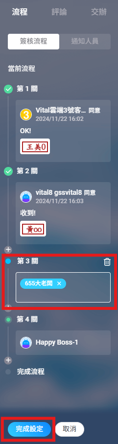 *請注意:一但按下【完成設定】即無法再將簽核者刪除,若是加簽給其他同仁,也會直接送出表單,請務必謹慎確認!