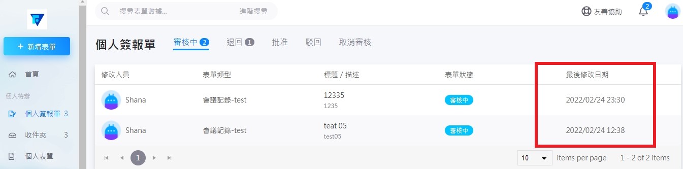 審核中的表單是依最後修改日期排序的,也就是最新修改的會在最上面。