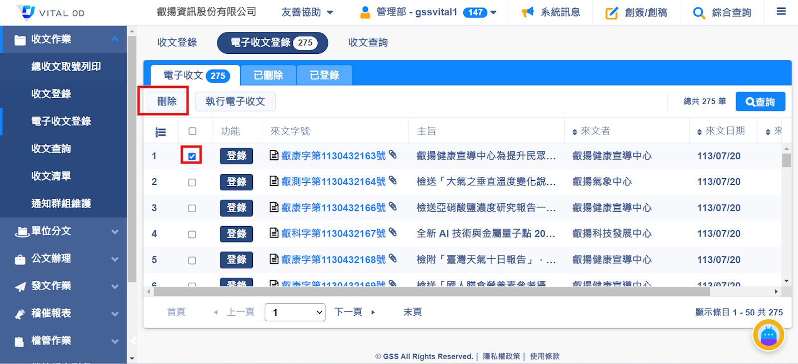 找到要刪除的公文以後,將框框打勾,再按上方的刪除。