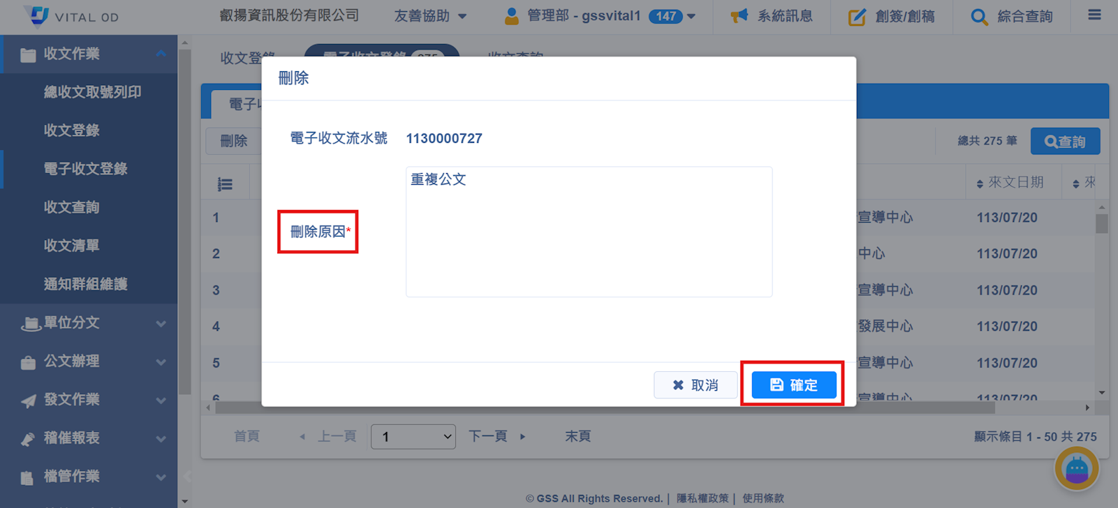 輸入刪除原因以後按確定,即可將公文刪除。