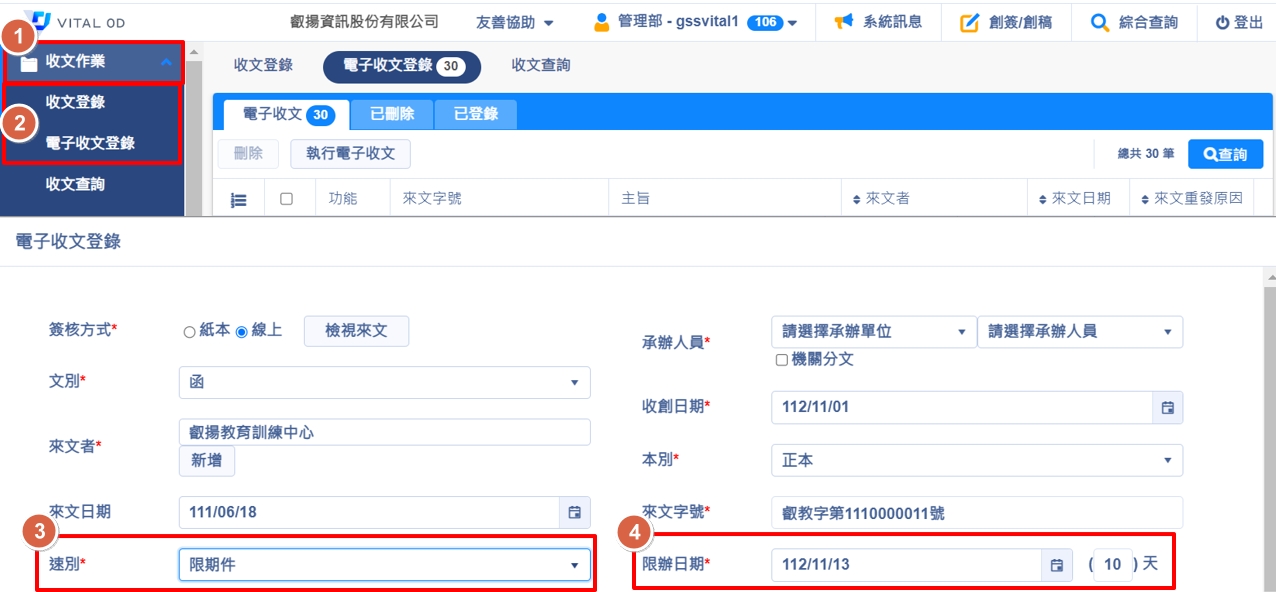 總收人員至【收文作業>電子收文登錄】可以選擇限期件以及限辦日期