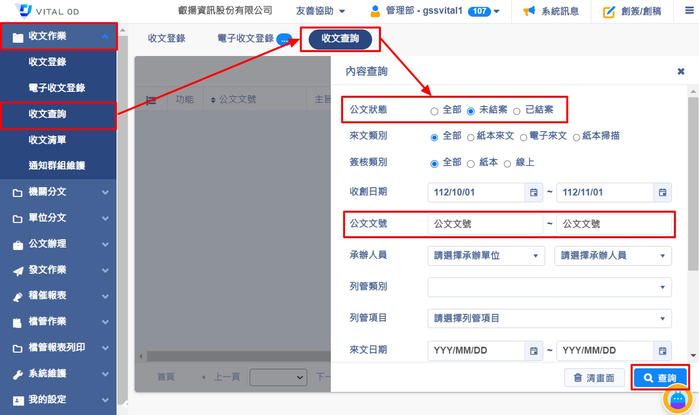 1. 首先,請依照下列步驟進入頁面:【收文作業】>【收文查詢】>【公文狀態:未結案】>【輸入文號】>【查詢】