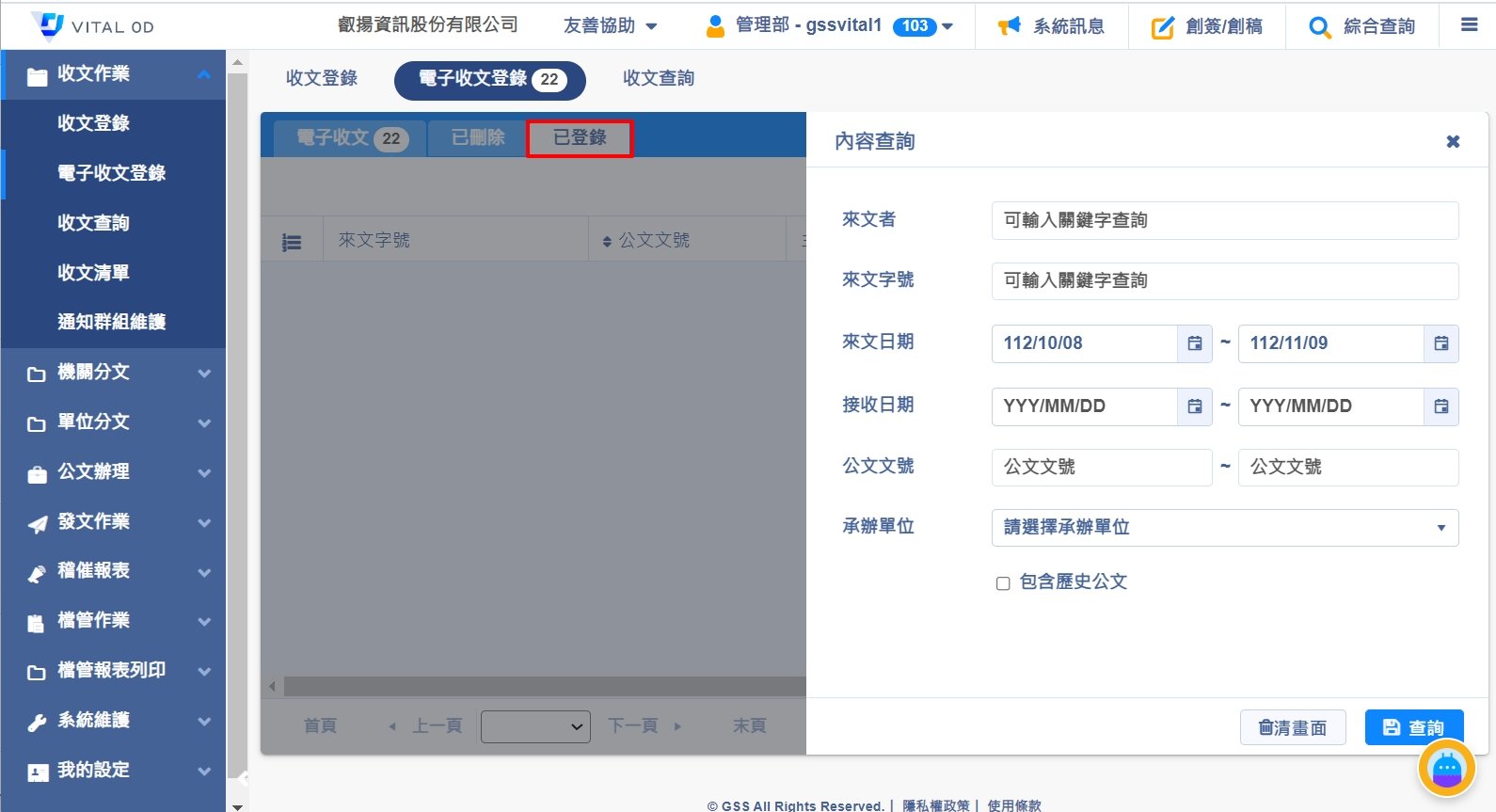 請至「收文作業」的「電子收文登錄」中點選「已登錄」查看。