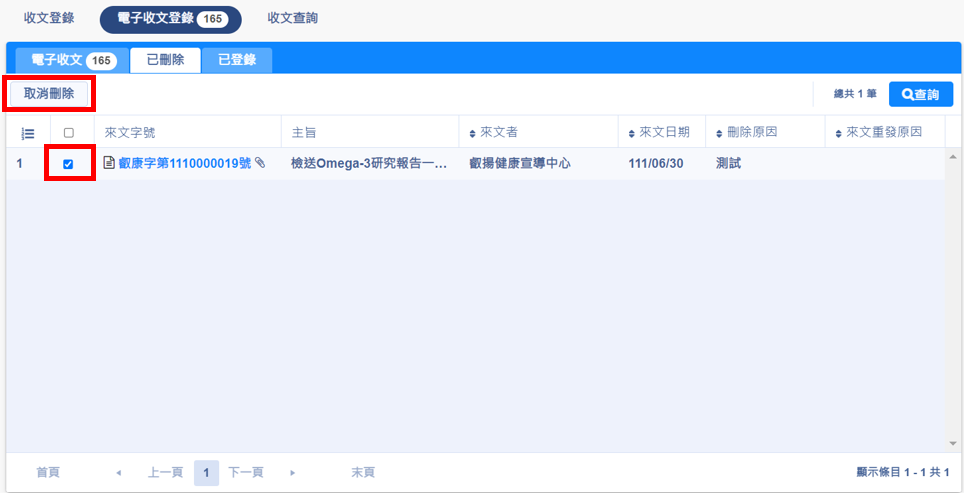最後選取您想刪除的公文,點選取消刪除按鈕就可以恢復已刪除的電子公文了