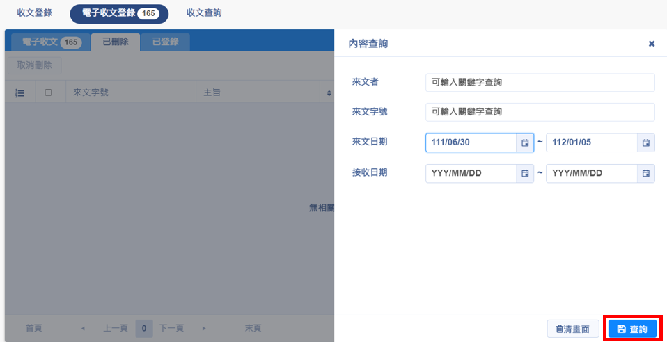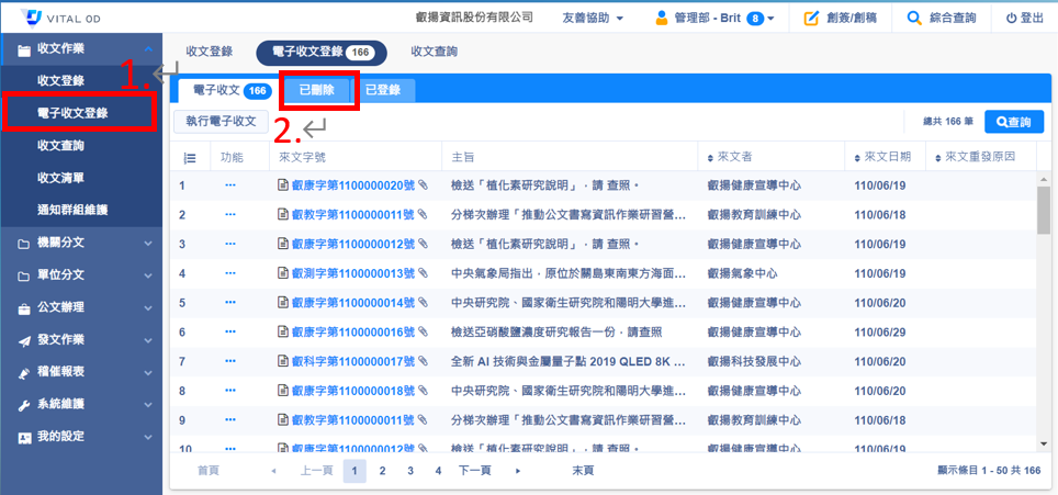 請先到 收文作業 >>電子收文收入 >>已刪除