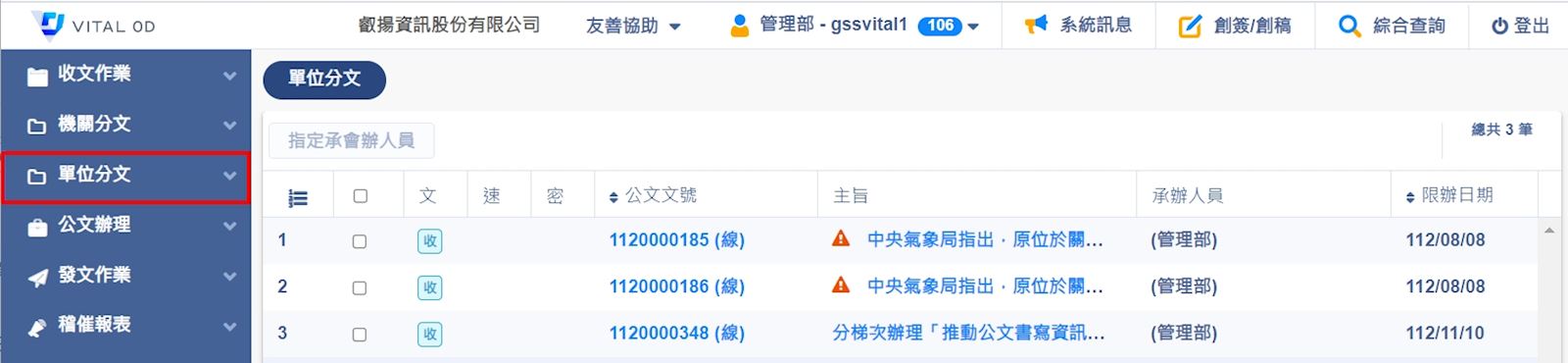 案例三:點選「單位分文」,需要下拉指定承辦單位,承辦人下拉選擇「單位分文」,點選存檔,會到該單位的『單位分文』。