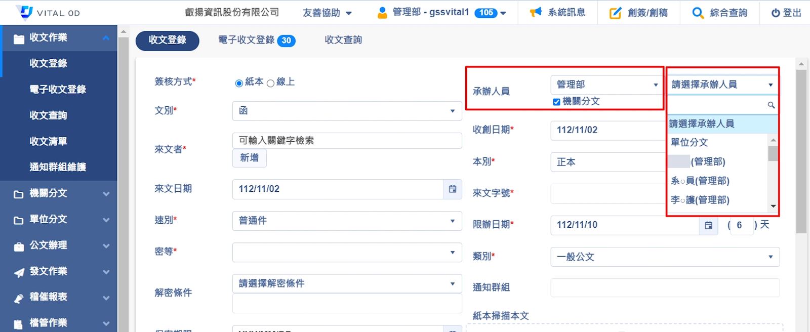收文登錄指定承辦人下拉選單的下方新增「選擇承辦人」、「機關分文」及「單位分文」三個選項。