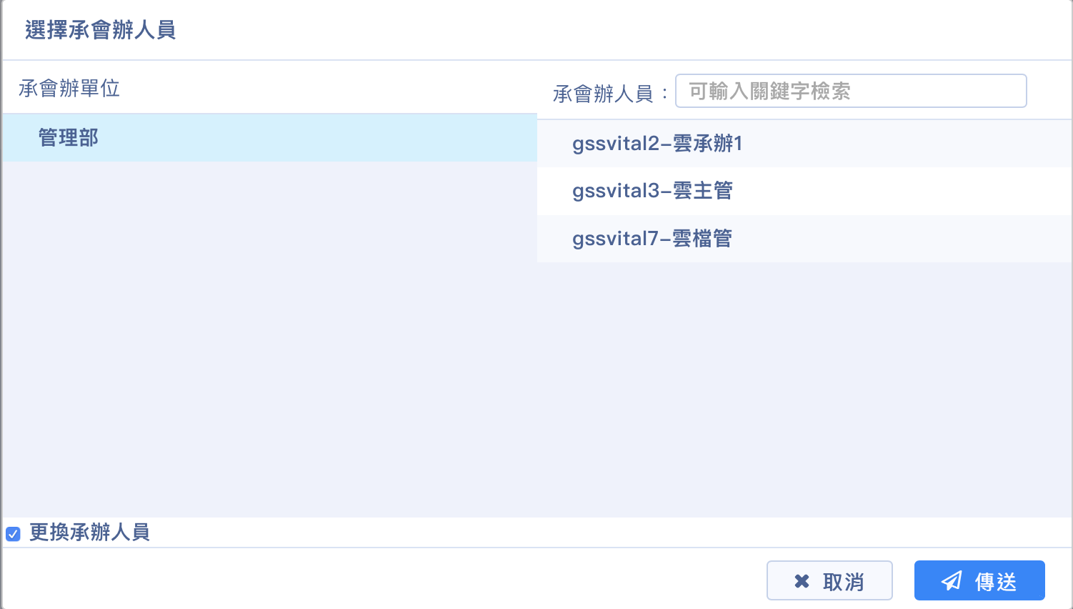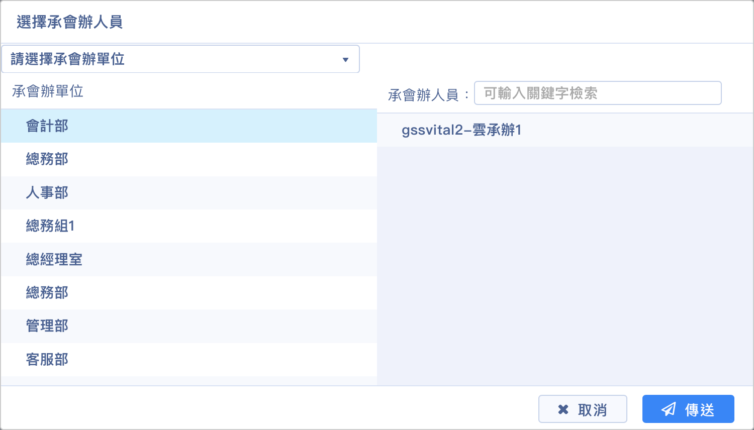 案例一:點選「選擇承辦人」,承辦單位及承辦人都要下拉選擇才能存檔,存檔後會直接分到承辦人公文簽核。