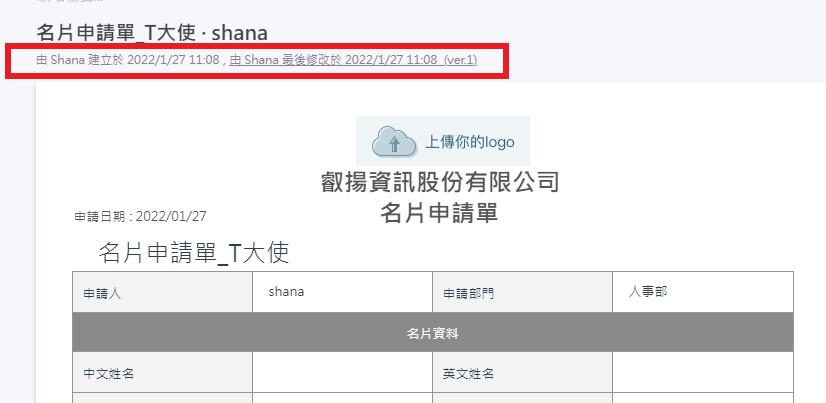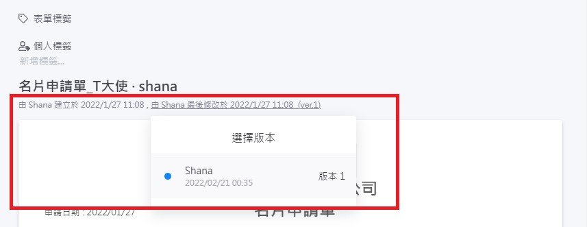 表單上方會顯示目前的版本和修改的時間,可以進行差異比較;點選進表單,即可在上方查看修改時間與不同版本的差異比較。