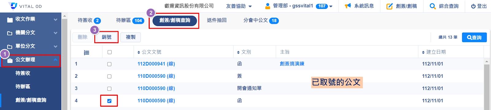 4. 若公文已決行,請先取消決行之後才可以銷號,圖文說明請見:https://faq.vitalyun.com/TW/OD#1830