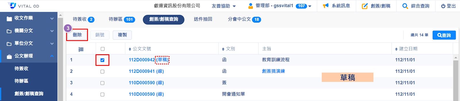 只有「草稿」才能刪除,已取號的公文請使用「銷號」,以下將分別詳細說明: