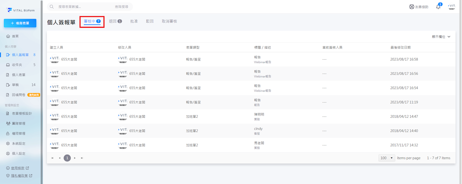 個人簽報單區塊中會有五種表單狀態: