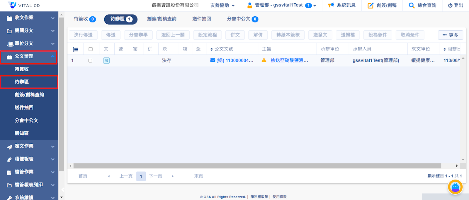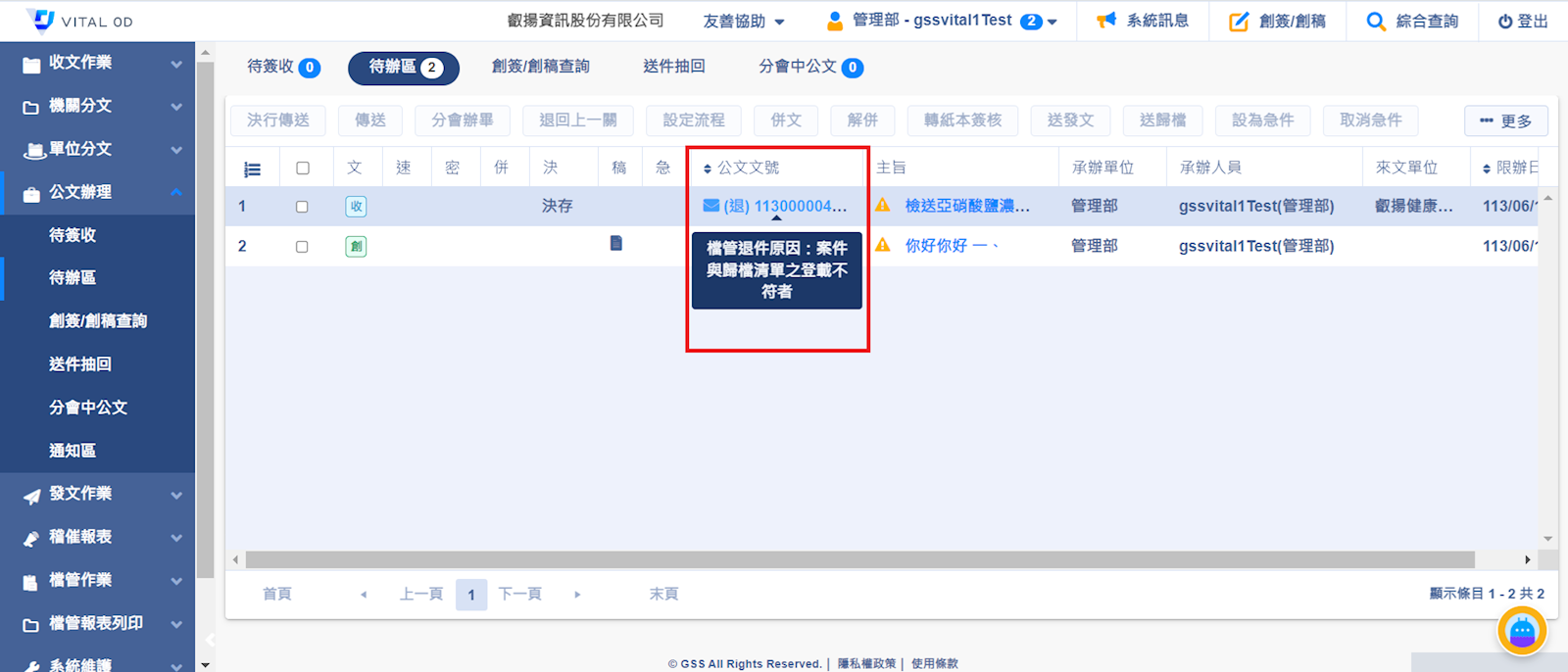 檔管點收退件時,在文號前面顯示[退],滑鼠游標移到文號上方,就會顯示檔管退件原因。