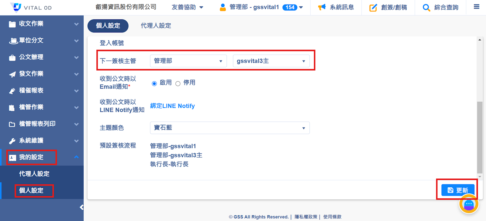 請您到【我的設定>個人設定】確認【下一簽核主管】有正確設定,設定好請點選【更新】。如果這個設定被手動刪除或未設定,將會導致流程跳過主管的簽核。