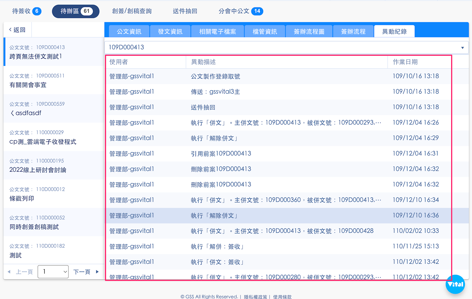 若對公文的流程有疑問、或想查詢公文現在的在哪位使用者的身上,可以查看公文的異動紀錄。