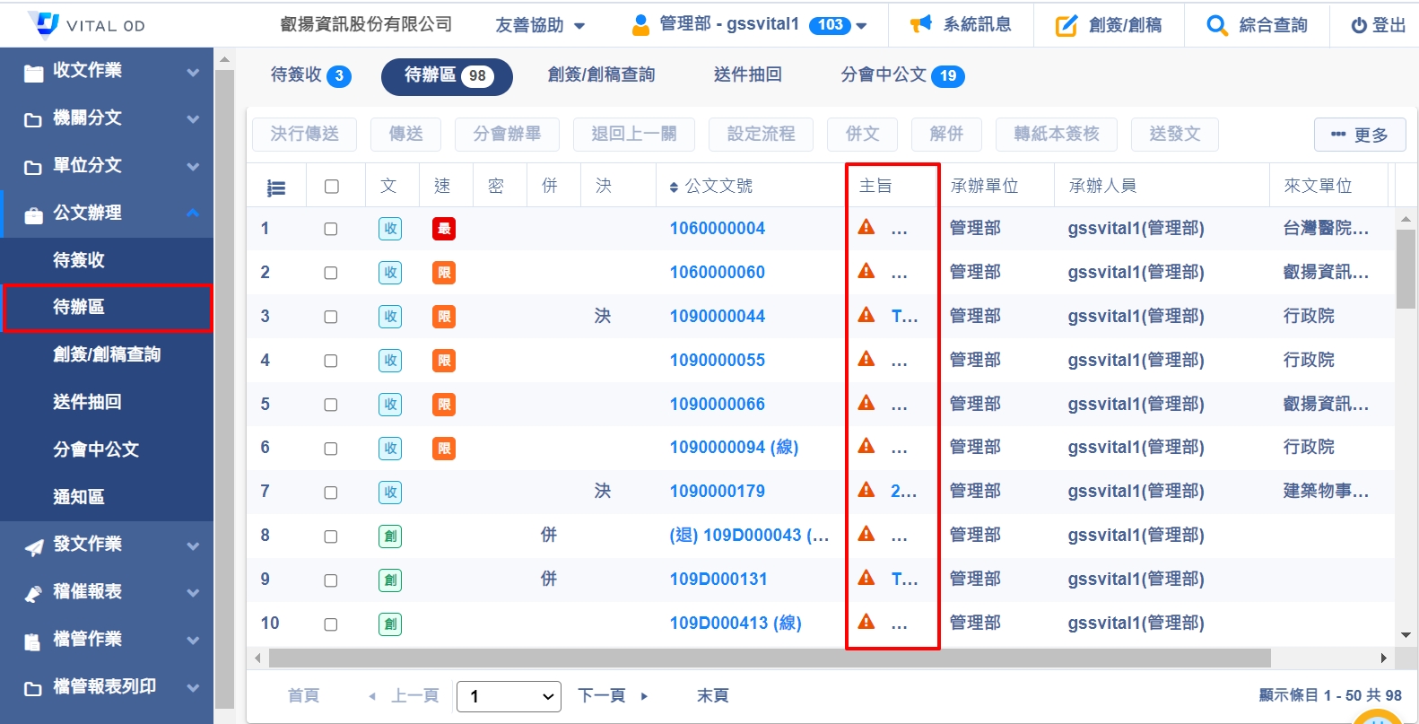 1. 若公文在您的待辦區,可以在公文列表中點選「公文主旨」;若公文不在待辦區,可以用「綜合查詢」中查找公文。