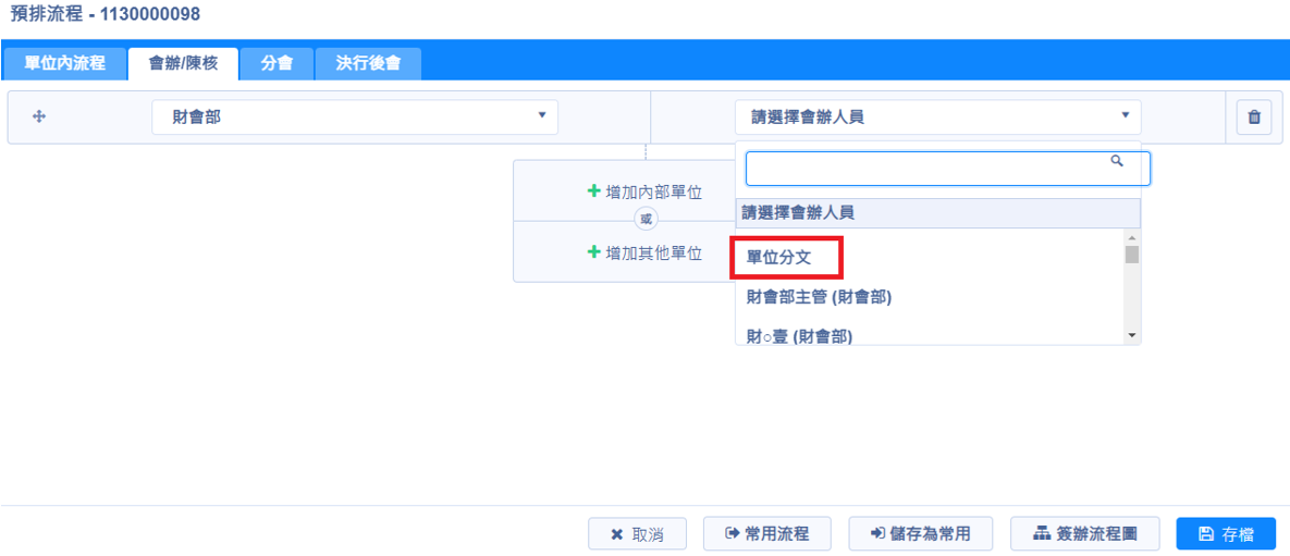 在設定流程的時候,選擇「會辦/陳核」頁簽,選到該單位內有屬於單位分文人員的角色時,人員部份可選擇「單位分文」,透過該單位分文來讓該單位的單位分文人員角色人員進行分文動作
