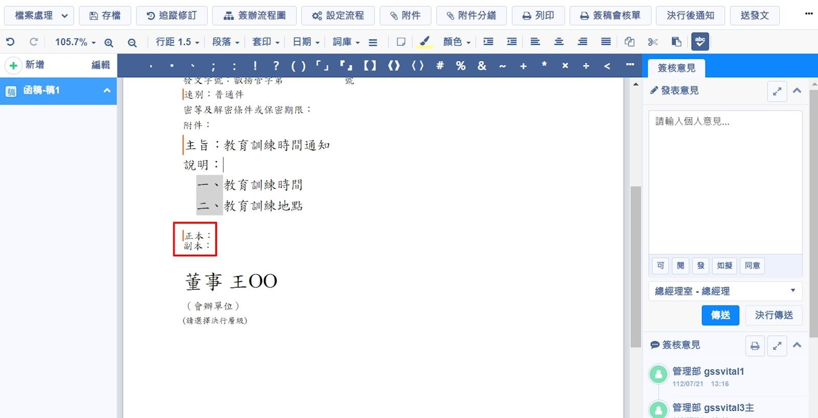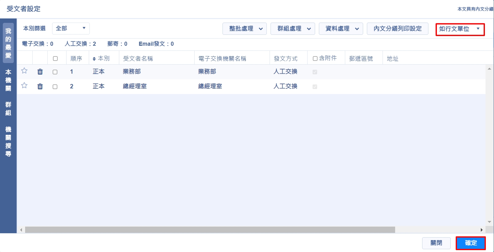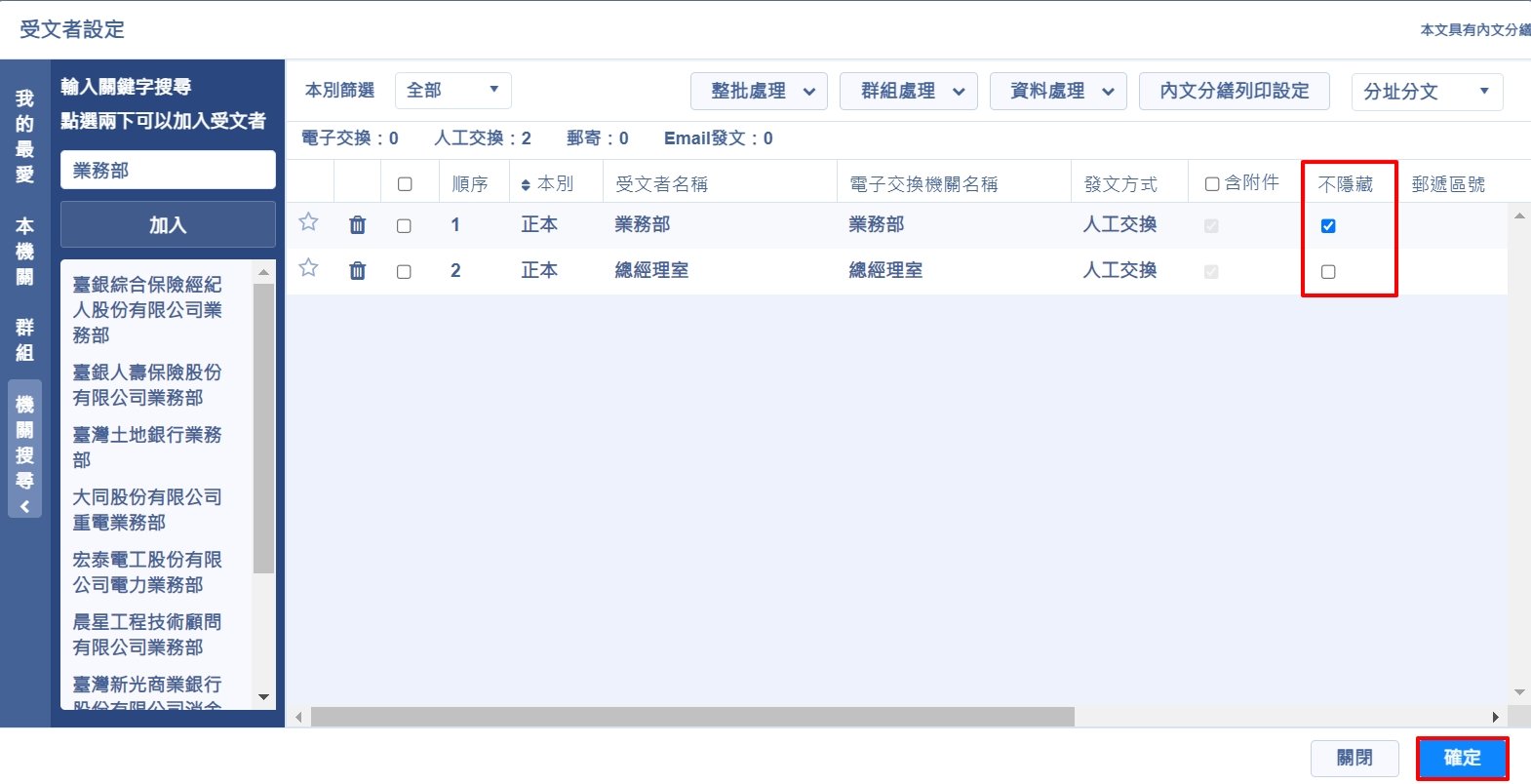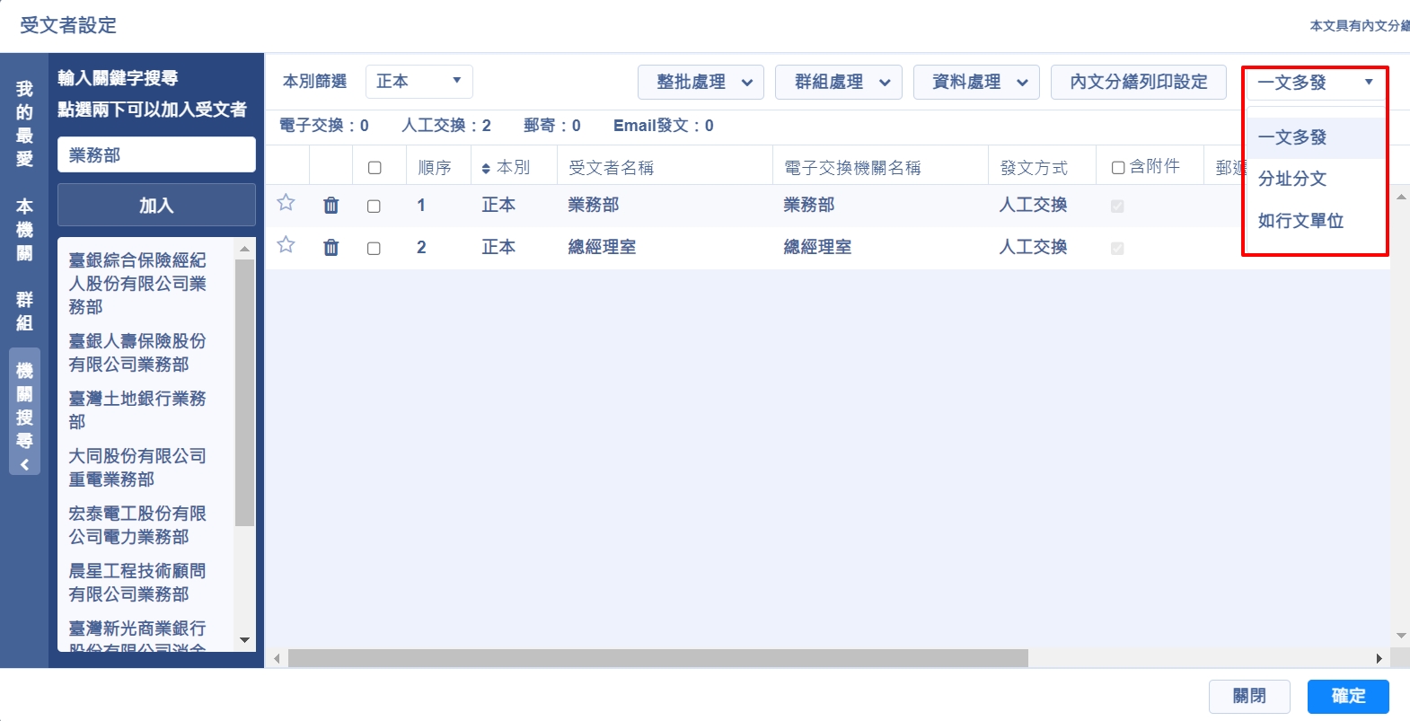 分址分文 : 當有多個受文者,希望受文者收到公文時文面上的正本或副本欄位只顯示受文者自己或是只顯示受文者自己以及某個受文者,可以設定分址分文