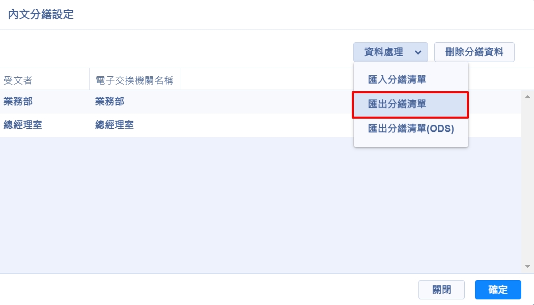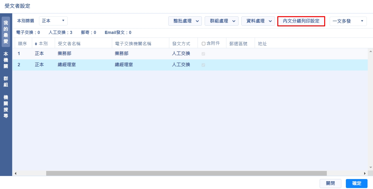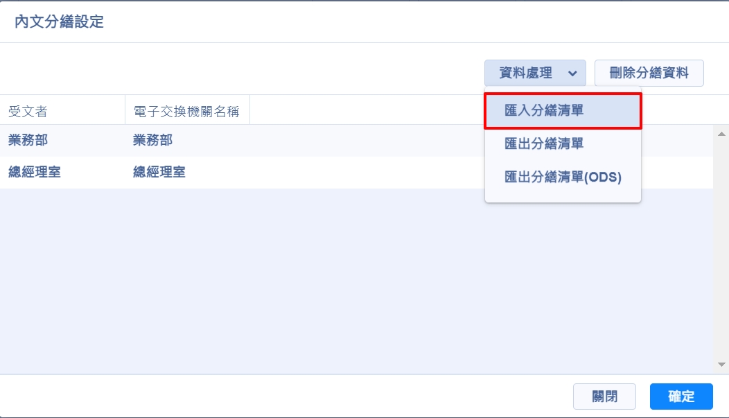 5.點選【確定】,顯示上傳成功後就可以關閉視窗,再點選受文著設定視窗的【確定】及完成分繕設定
