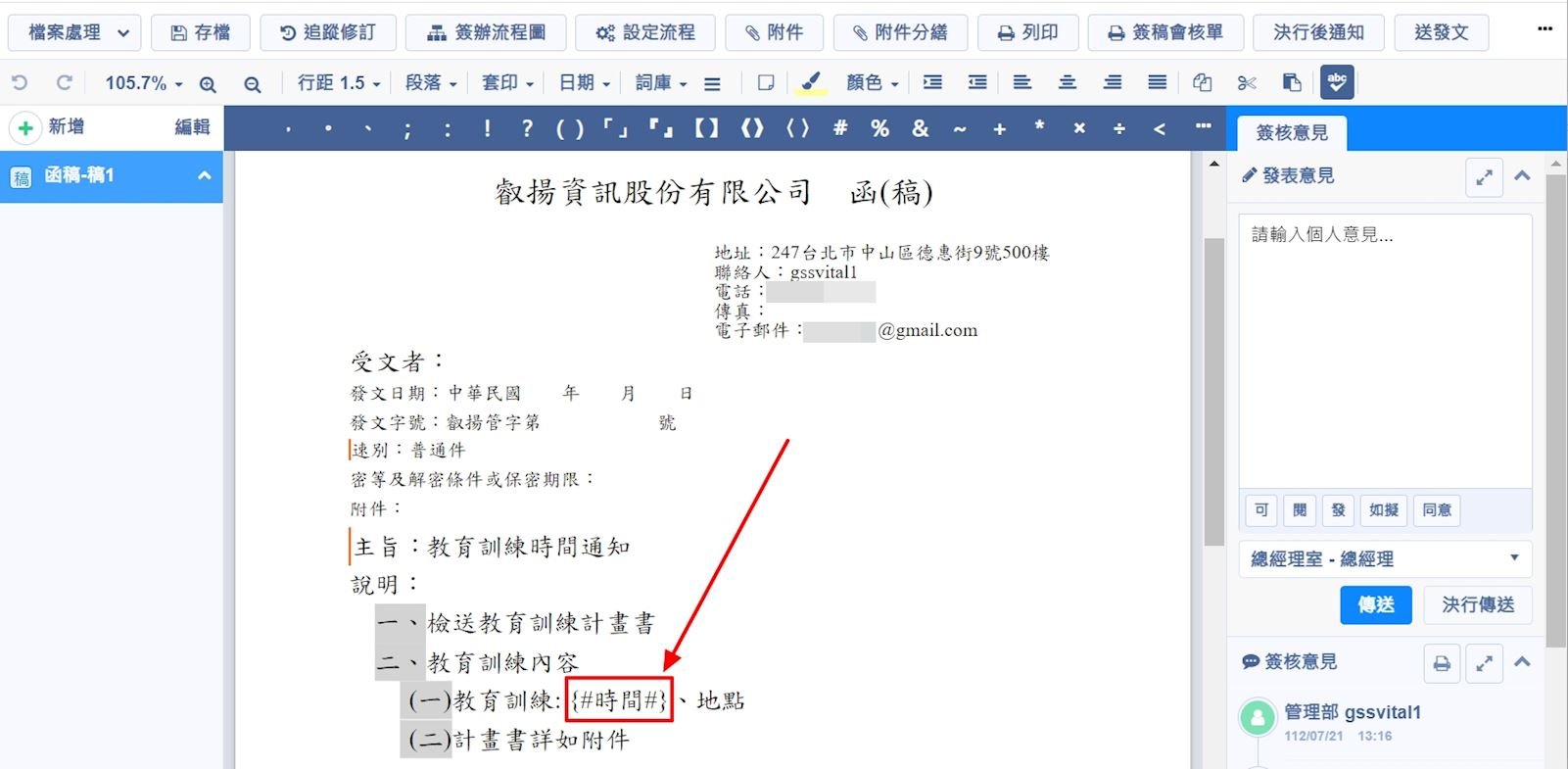6.回到編輯公文畫面,游標點選需要進行內文分繕的位置,在上方功能列點選【套印】,下拉選單選擇您要套印的欄位,選擇後您就可以看到文面上有雙#號的欄位名稱