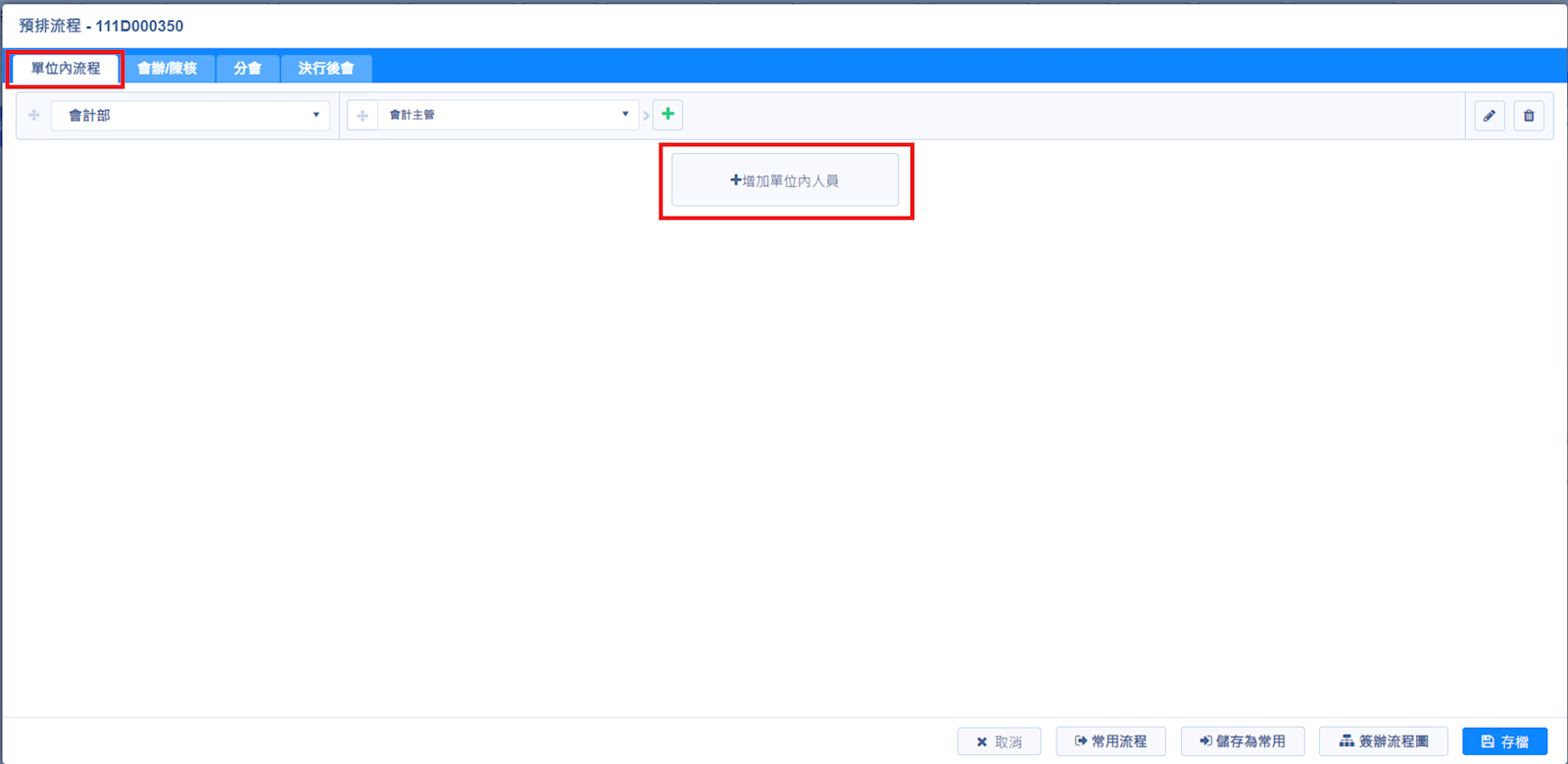 如要給不同部門同仁簽核,請用【設定流程>會辦/陳核】或【設定流程>分會】,請參考 : 如何設定分會或設定常用流程?