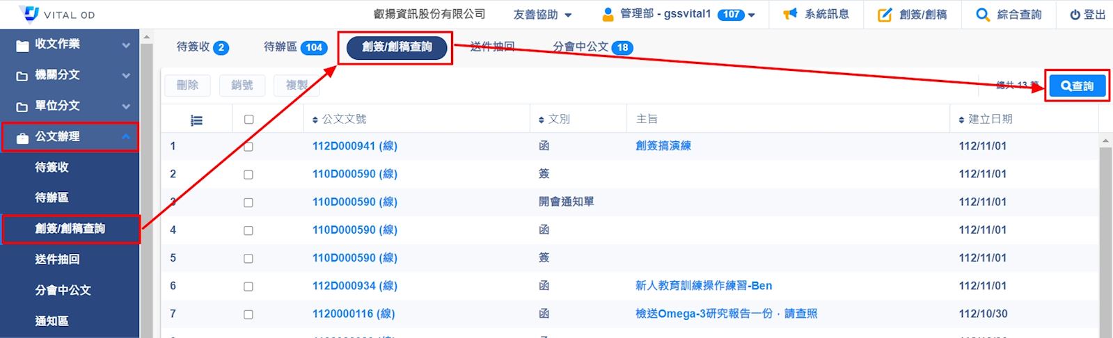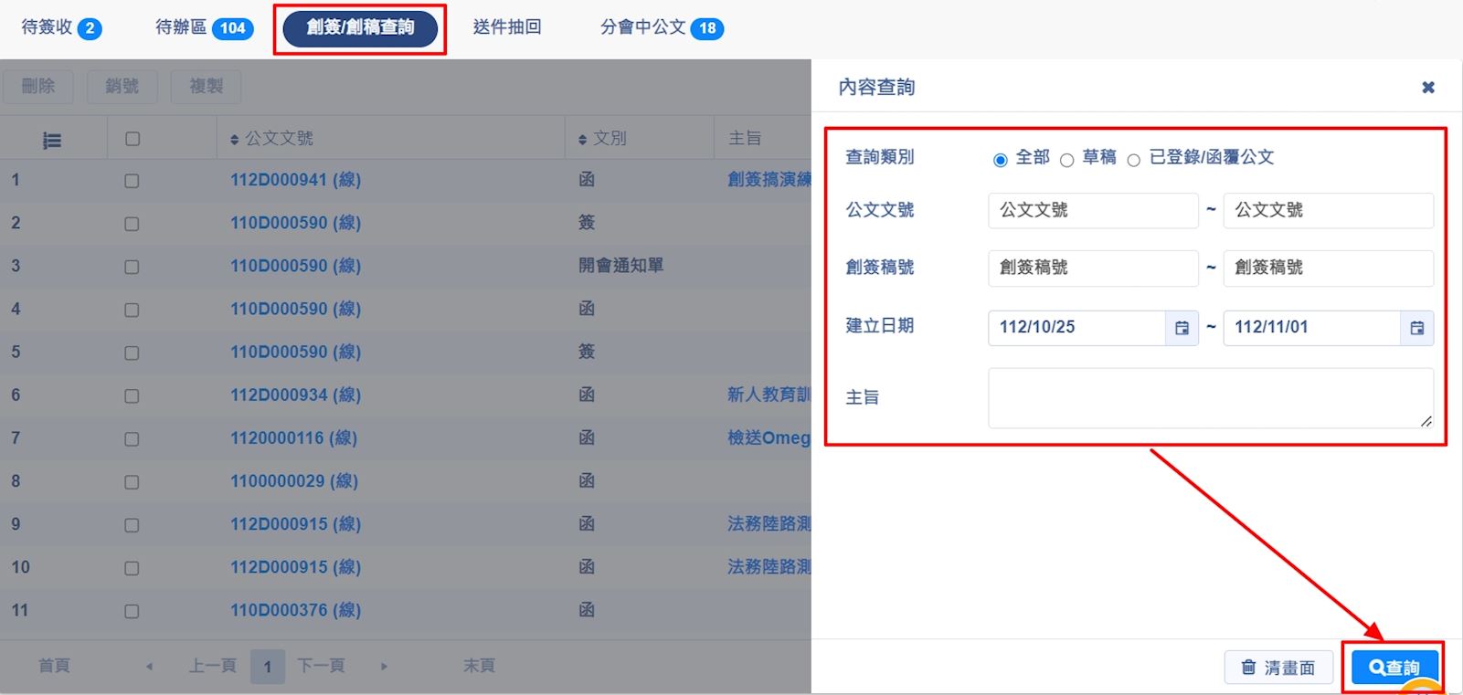 1.請在左方列表點選【公文辦理】>【創簽/創稿查詢】>【查詢】