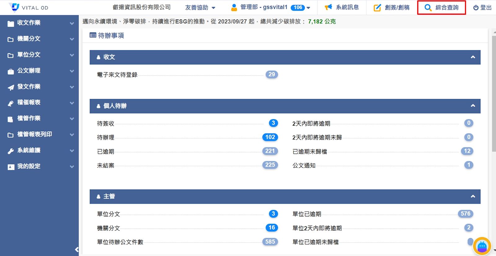 1. 若要查詢公文,請點選系統右上角的【綜合查詢】。