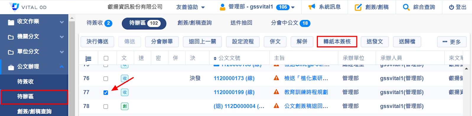 點選『公文辦理』進入『待辦區』,勾選要修改的公文後,於上方列表中點選『轉紙本簽核』即可。