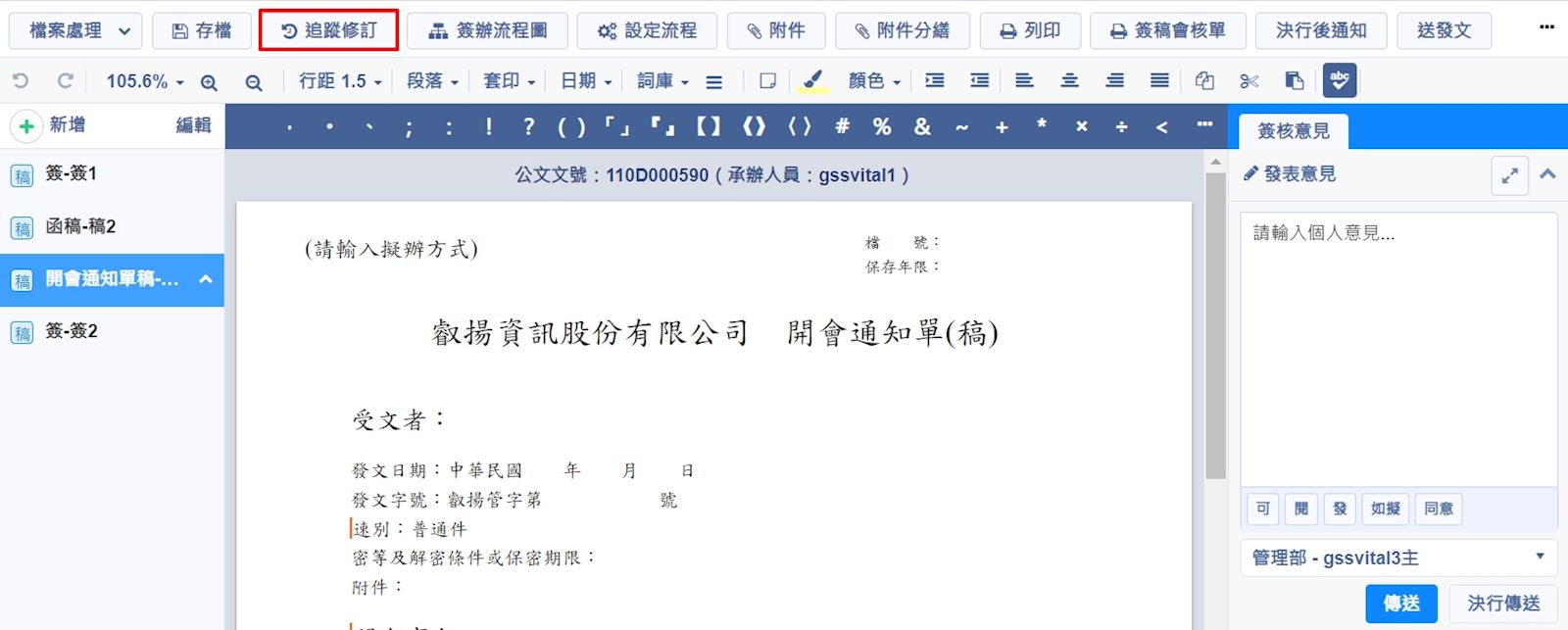 1.請點選公文文號進入公文後,點選畫面上方【追蹤修訂】