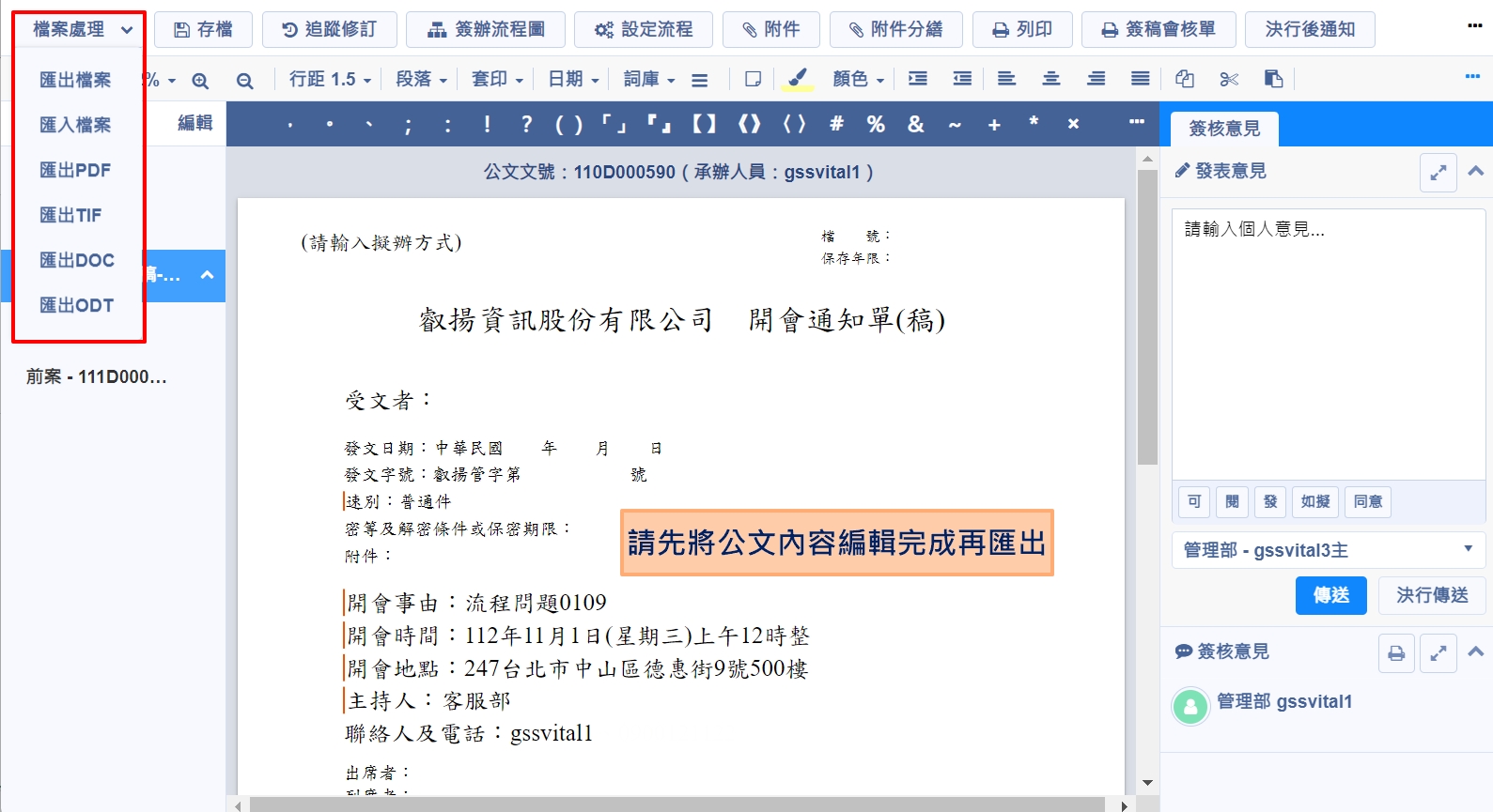 於公文編輯製作畫面中,點選「檔案處理」可將編輯好的公文匯出儲存在電腦內,做為範本使用,若要使用時,再透過此功能匯入。