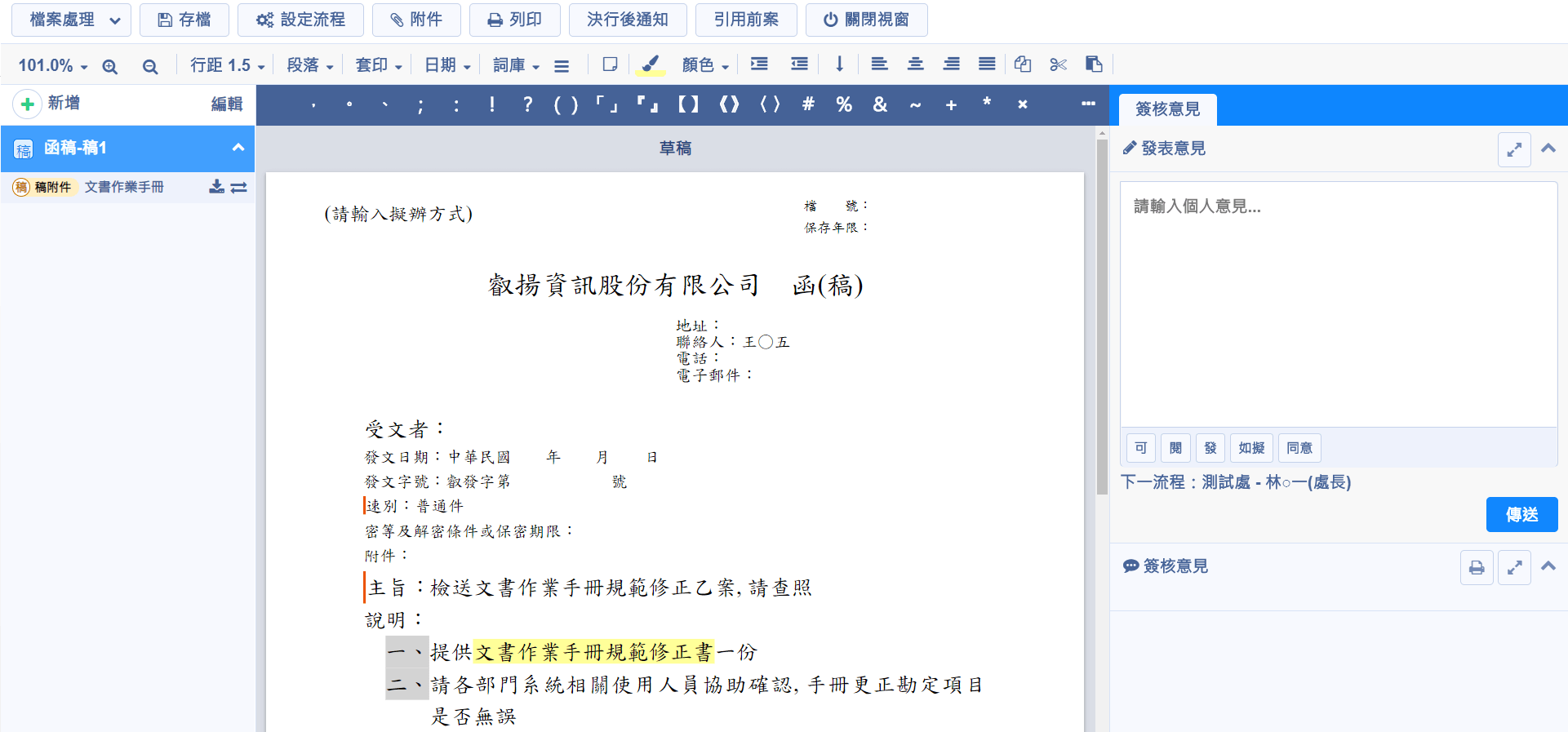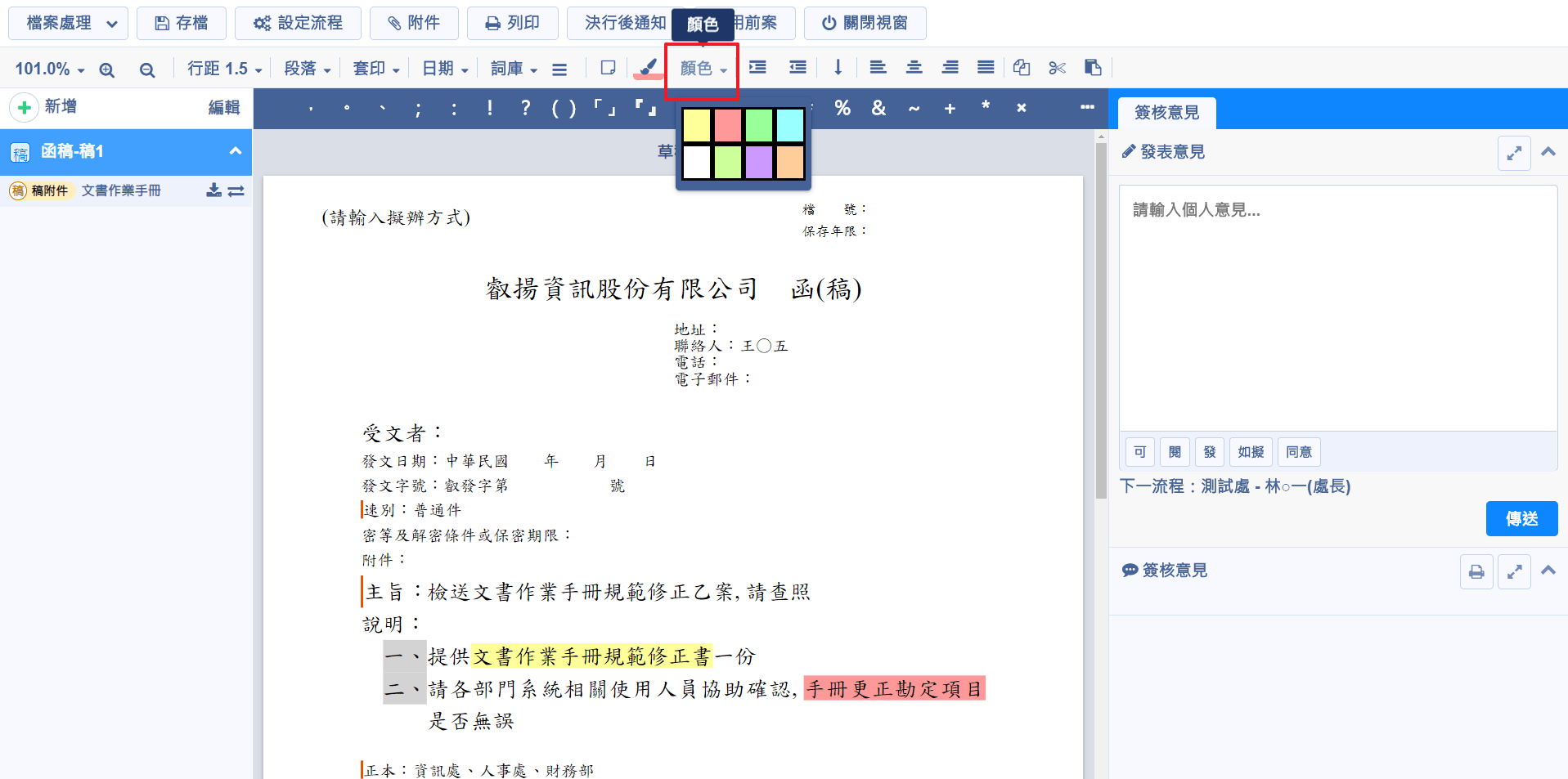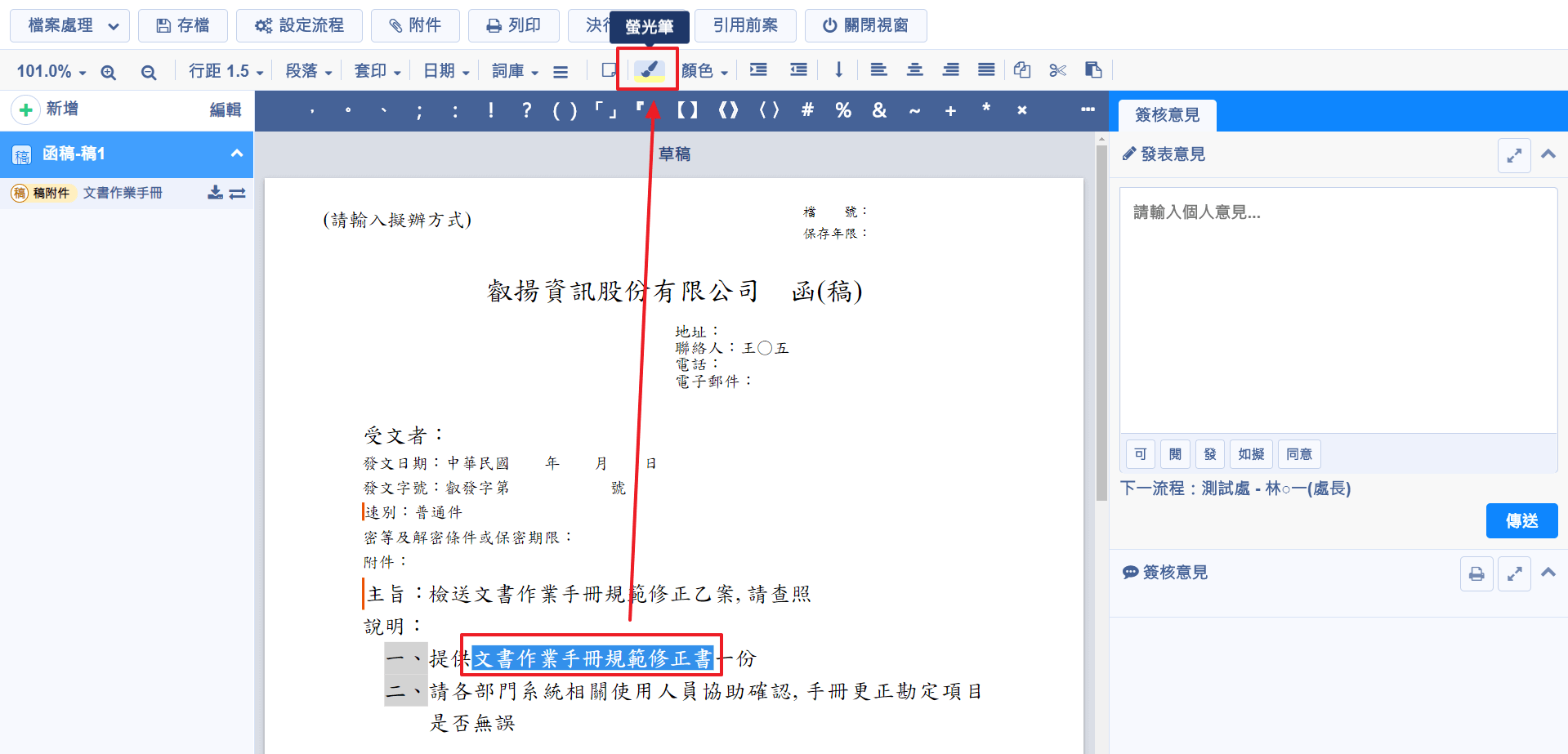 在公文編輯畫面框選一段欲使用螢光筆的文字後,點選【螢光筆】,即可將該文字標記螢光筆。若想要取消螢光筆標記,反白已標記的文字,然後再按一次螢光筆按鈕即可完成取消。