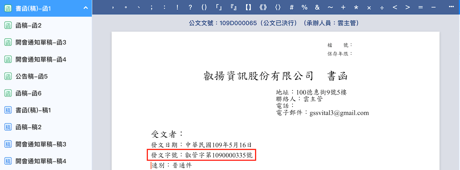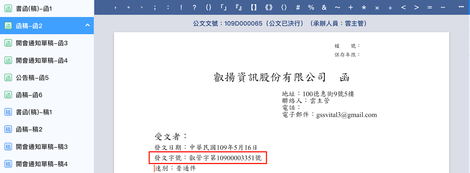 例如:叡管字第1090000335號,叡管字第10900003351號(如下圖)。如果同一份函稿多個受文者則發文字號就沒有支號。