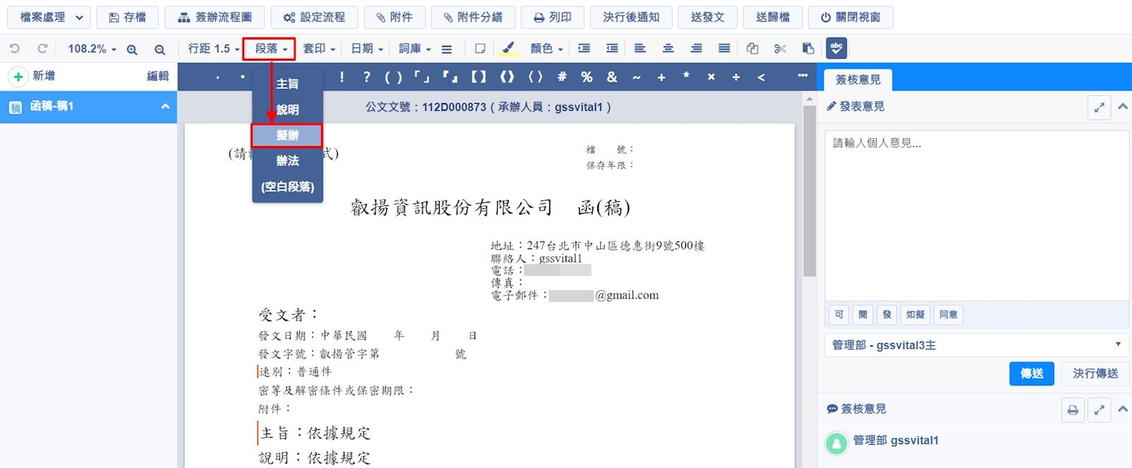 請在介面上方點選【段落】→【擬辦】。