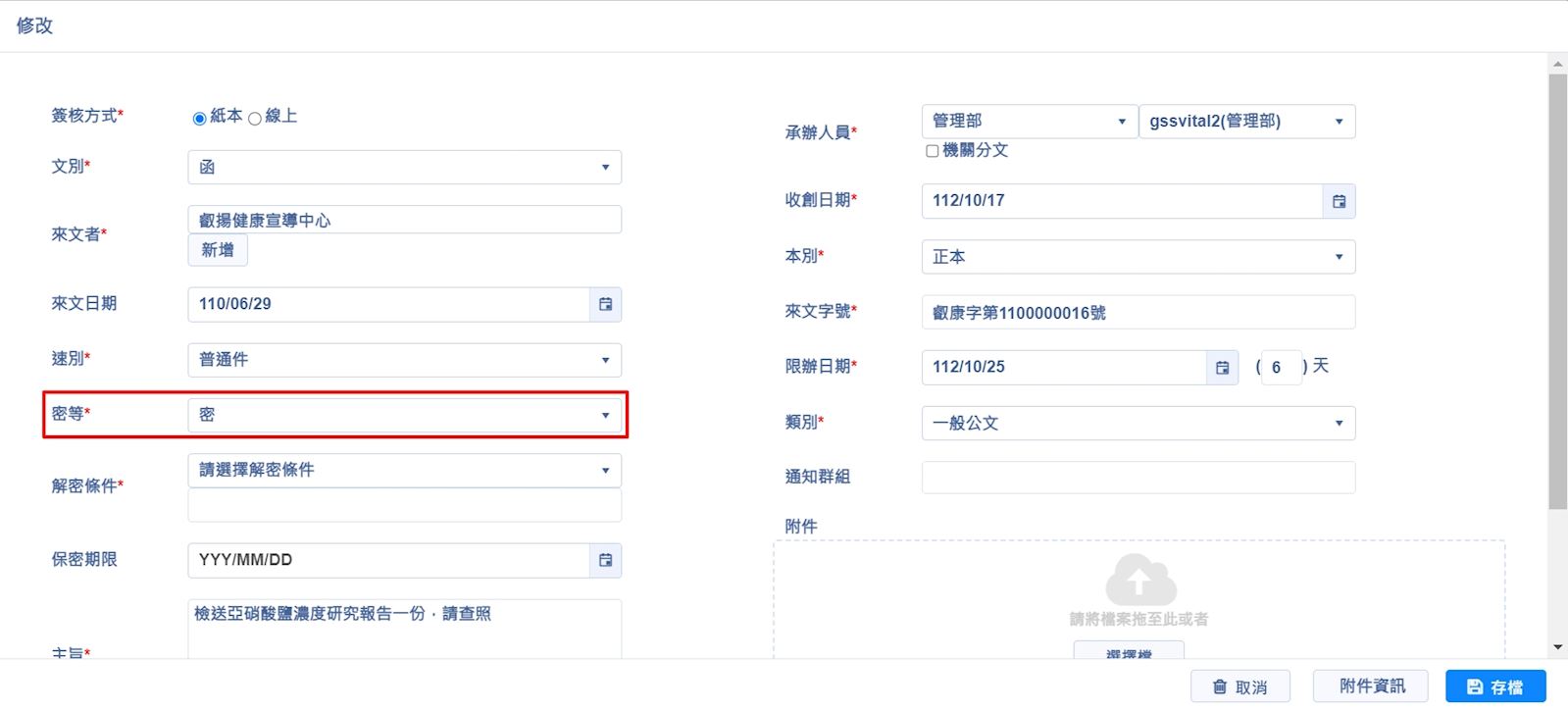 未結案收文可透過【修改】,編輯公文資訊:【收文作業>未結案收文查詢>修改】