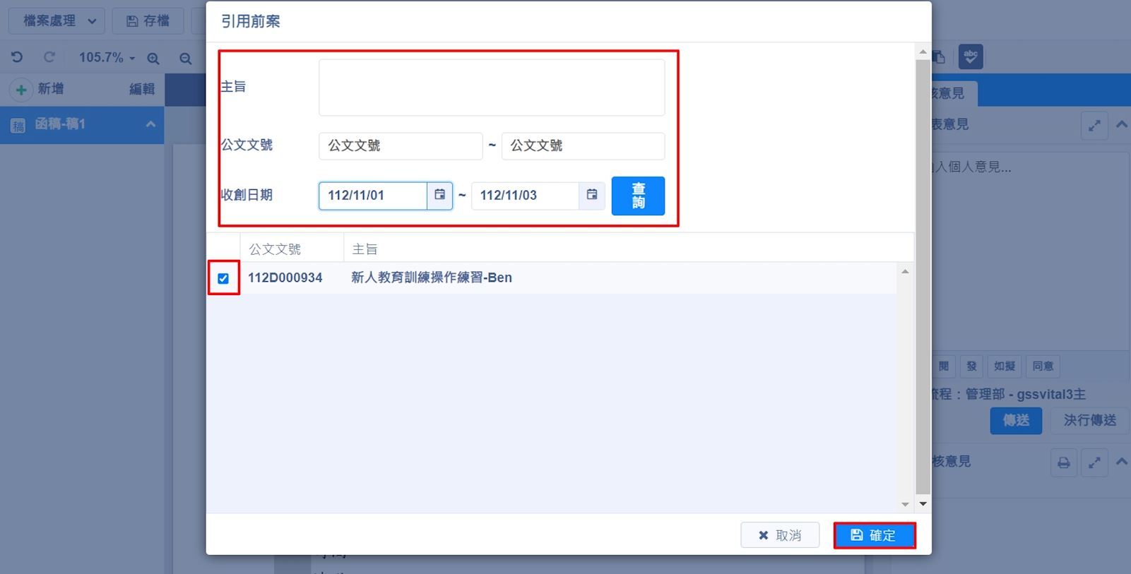 畫面會跳出引用前案視窗,你即可輸入要引用的公文的【主旨】、【公文文號】、【收創日期】做查詢,點選【查詢】之後即會出現您所搜尋的公文,請【勾選】該公文按下【確定】。