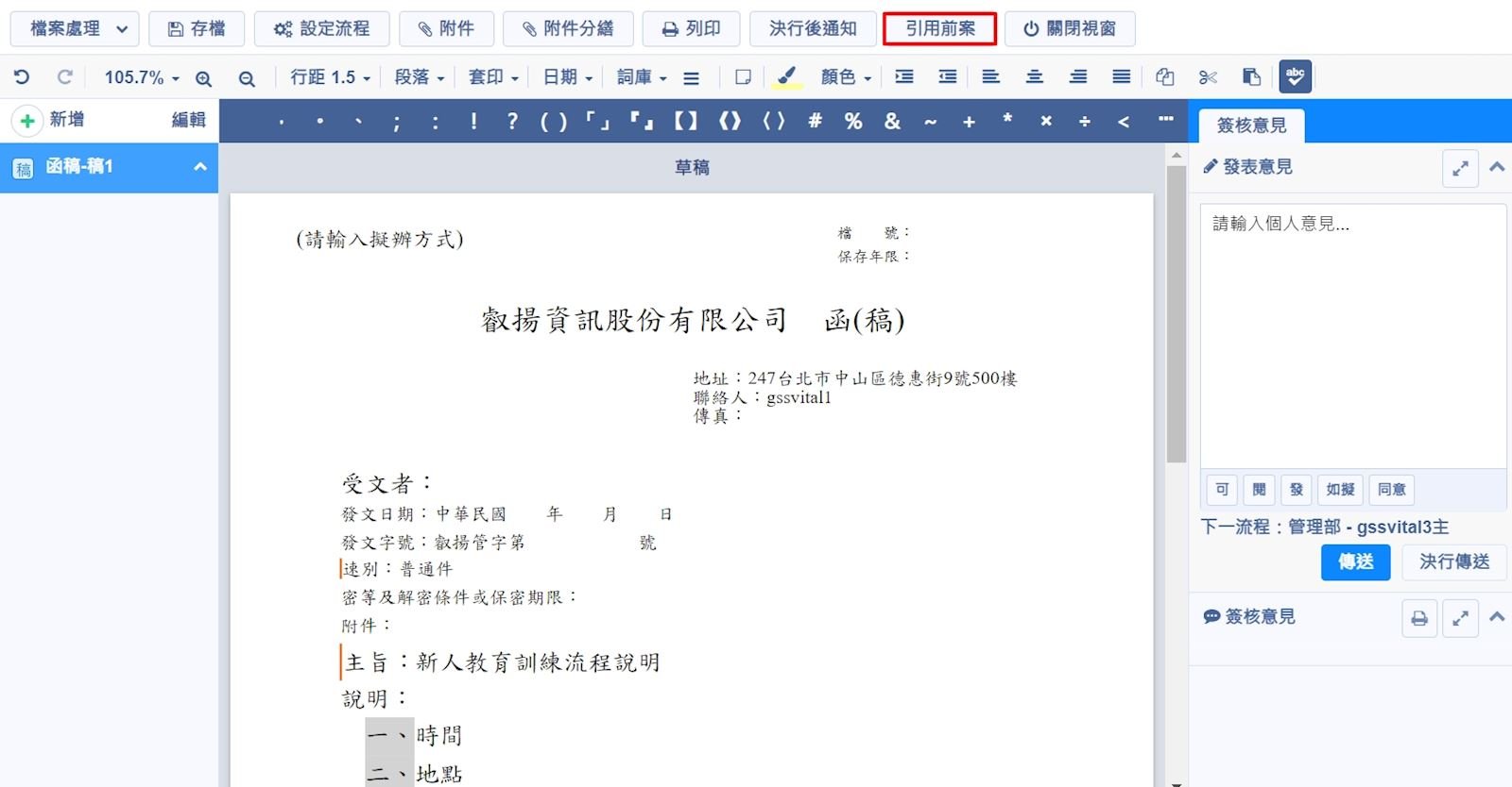 如果有來文或者創簽稿時,想讓主管參考過去辦結的公文可以使用引用前案,操作方式請參考如下步驟: