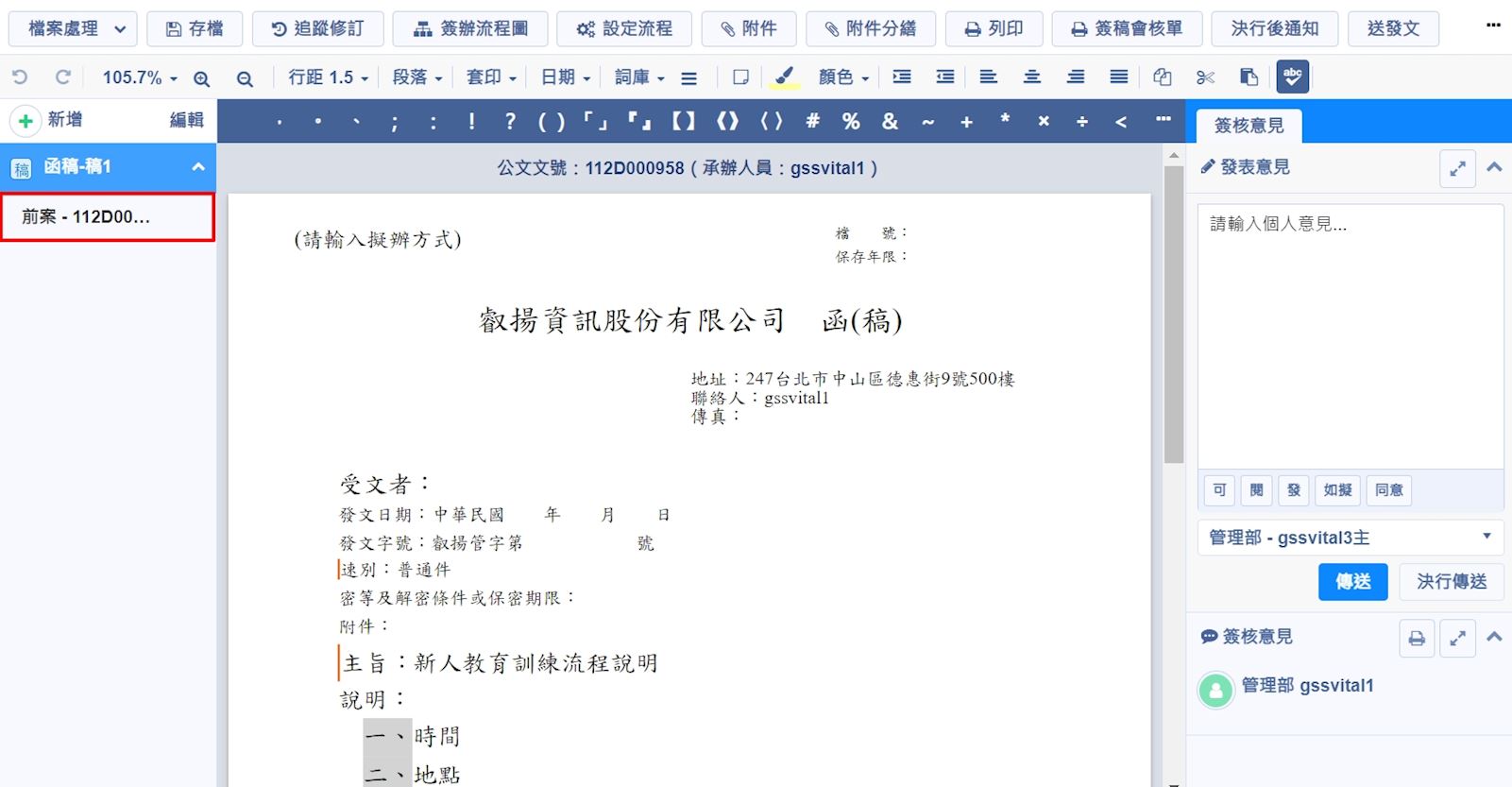 於公文編輯畫面左方工作列便會出現您所選擇的前案以及文號