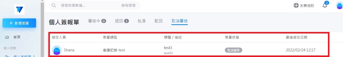 取消審核的表單會顯示在【個人簽報單>取消審核】的區塊中。