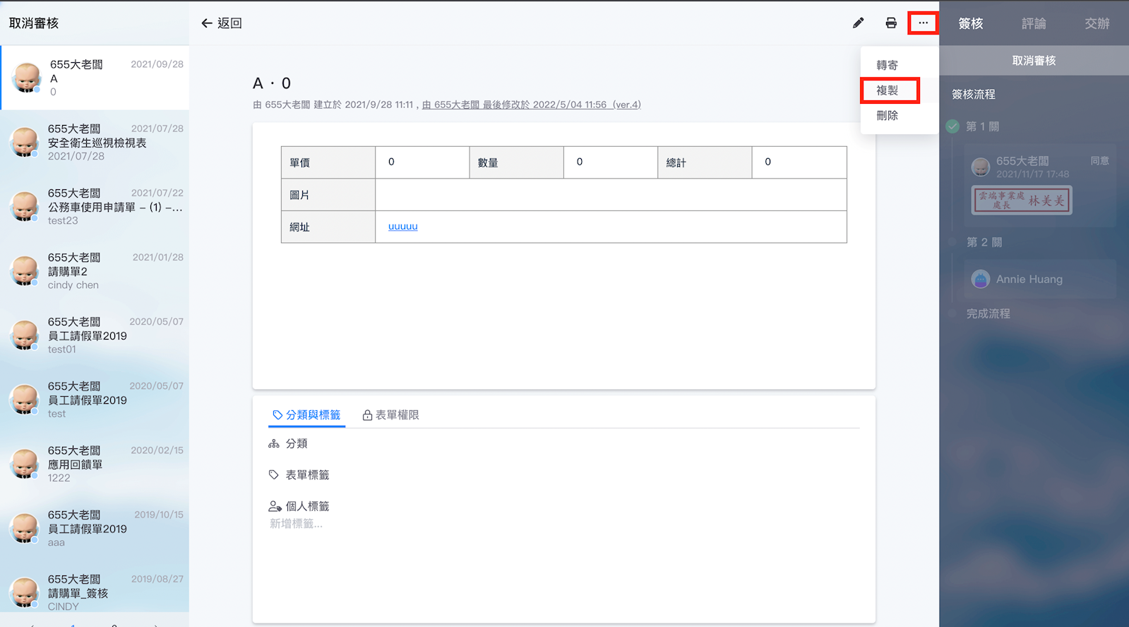 2. 點入該表單後,可以點擊右上方的「三點圖示」,複製該表單並修改內容後重送。