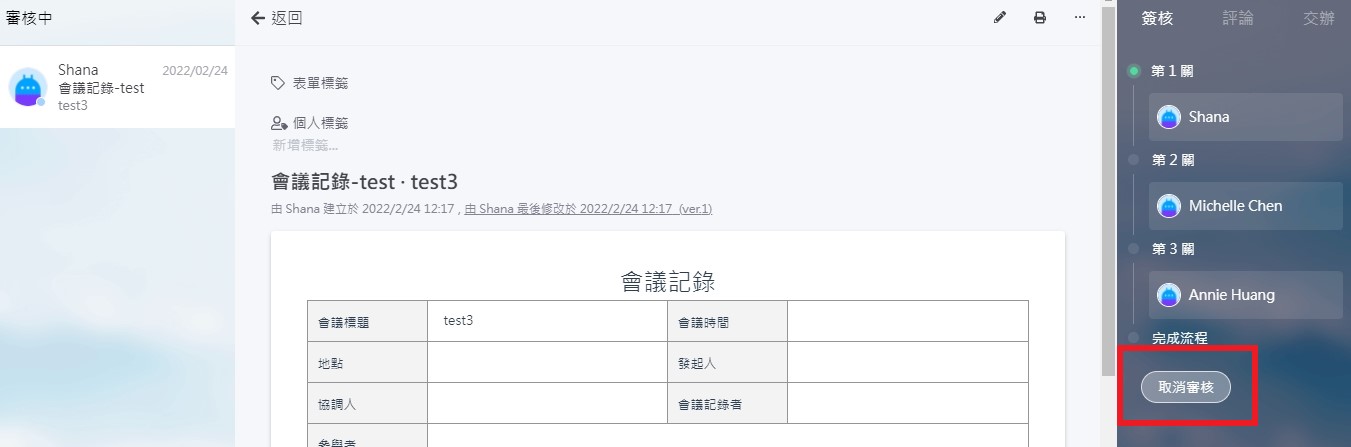 審核表單送出後,若需要再次修改表單,表單的提交者可以將該表單取消審核。