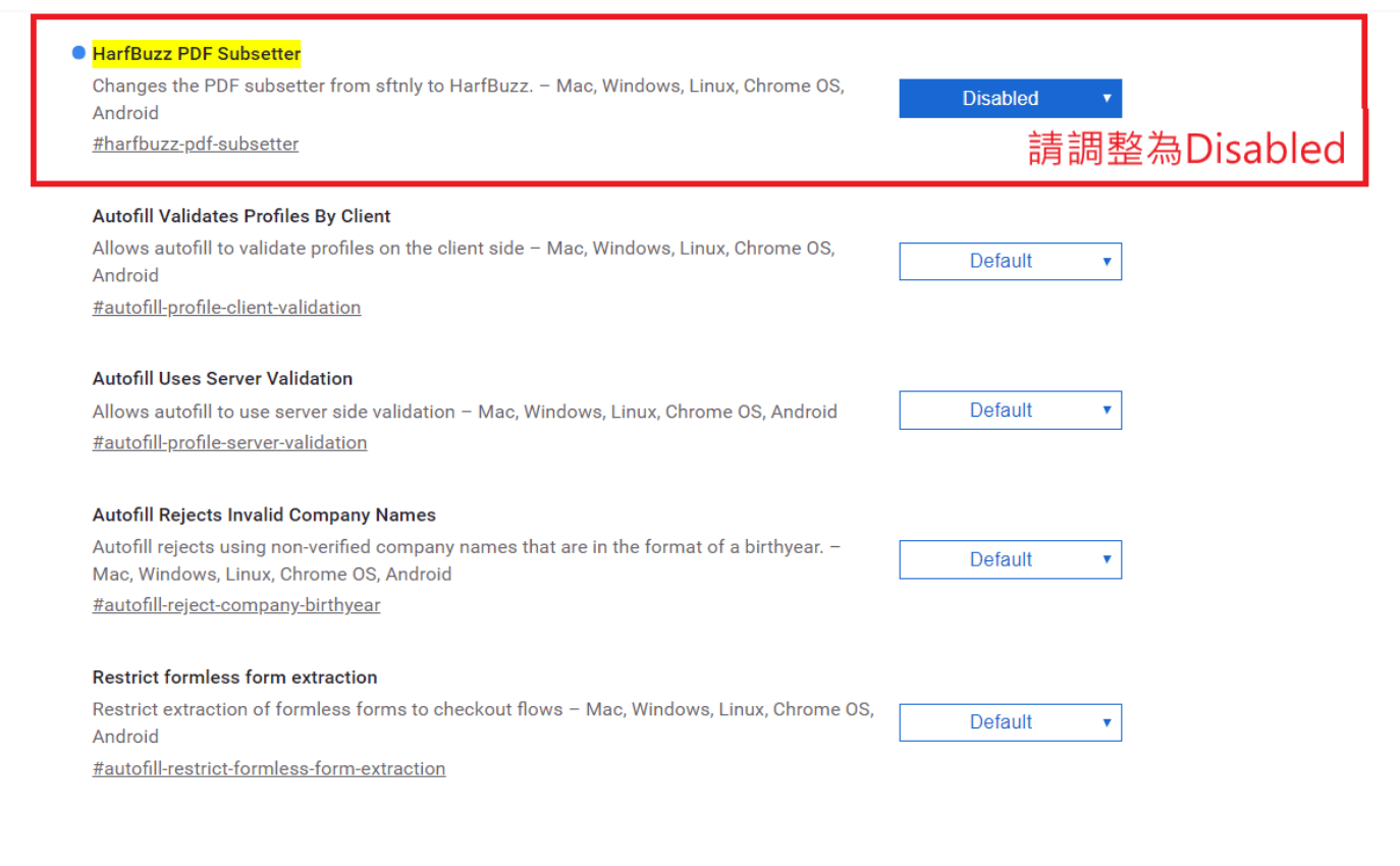 2、畫面上可以看到這個選項:「HarfBuzz PDF Subsetter」,請下拉並把設定值改為Disable
