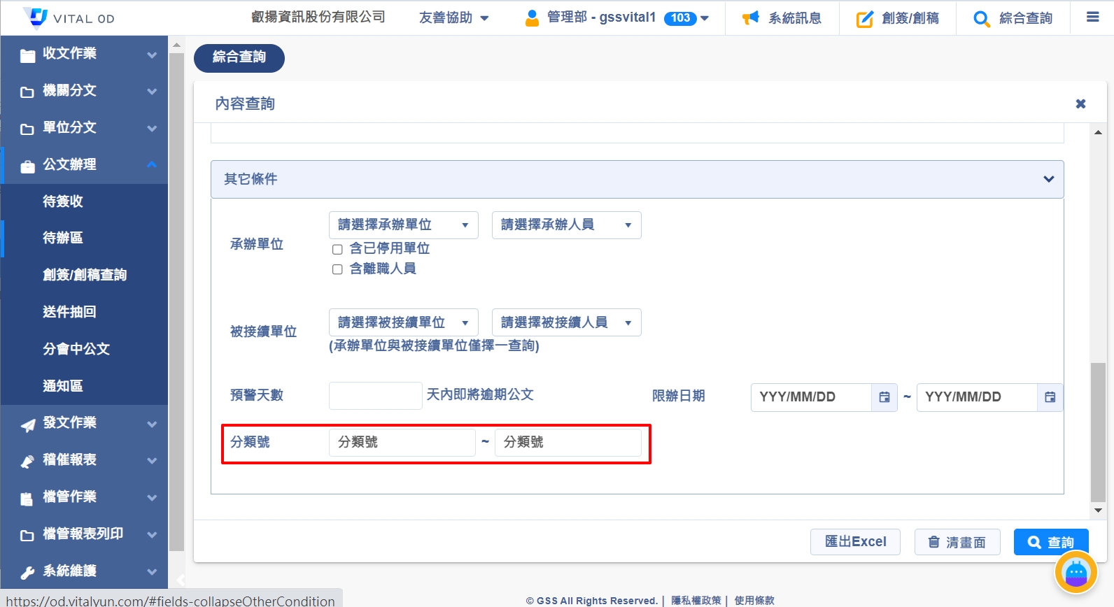 如要用分類號(檔號)查詢公文,請點選【綜合查詢】,在【其他條件】裡的分類號輸入分類號以後,請將【收創文條件】裡的【收創日期】刪除,確保不會因為時間區間搜尋不到。