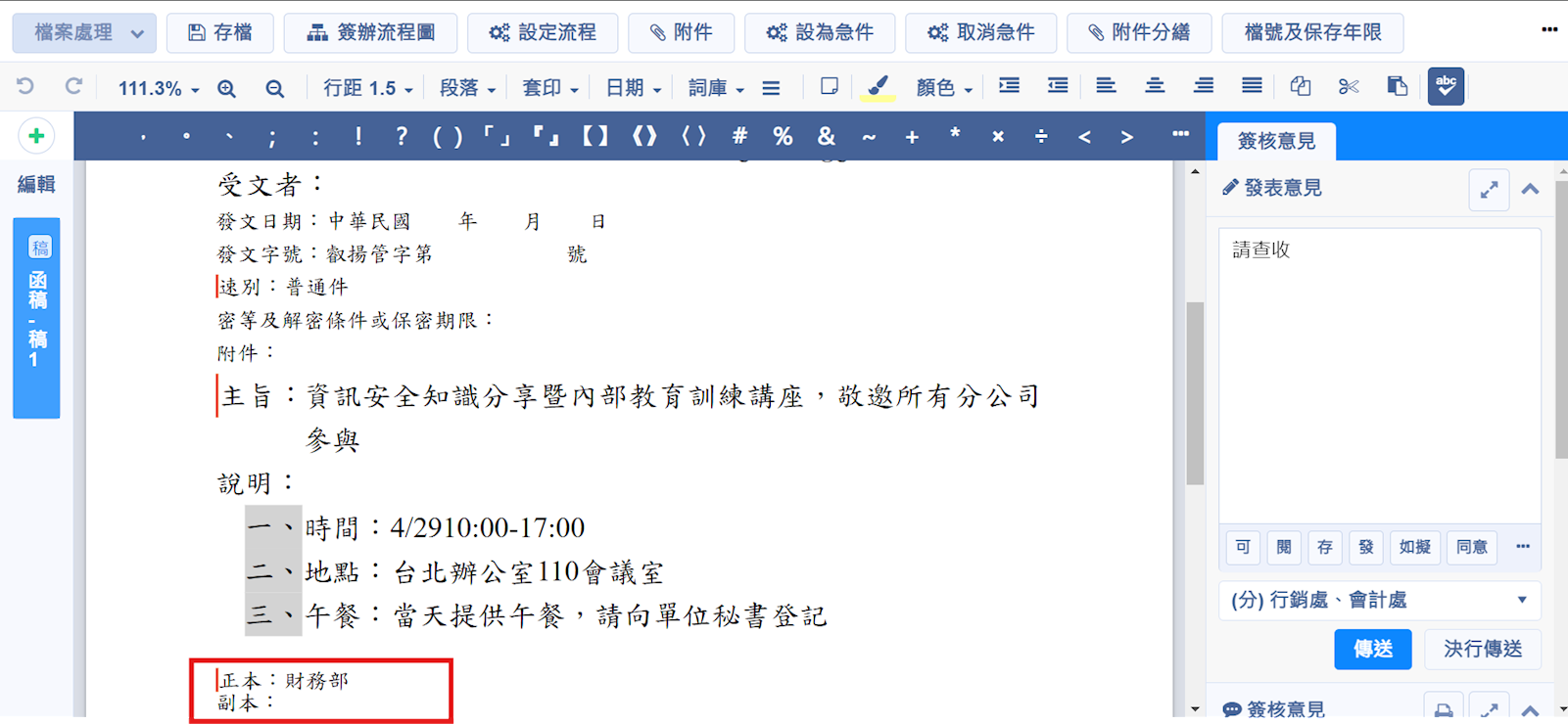 請先進到公文文面,點選【正本】會進入【受文者設定】。