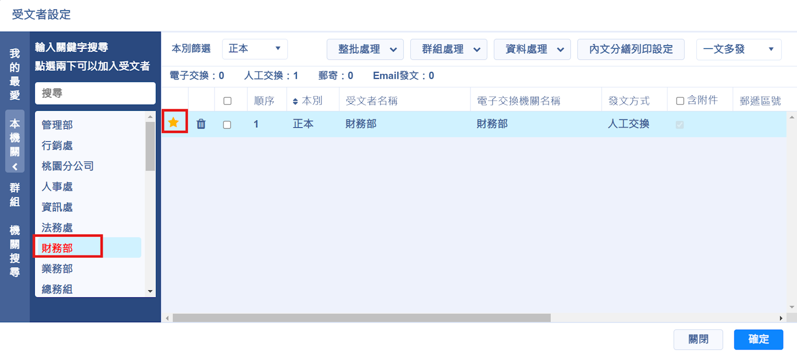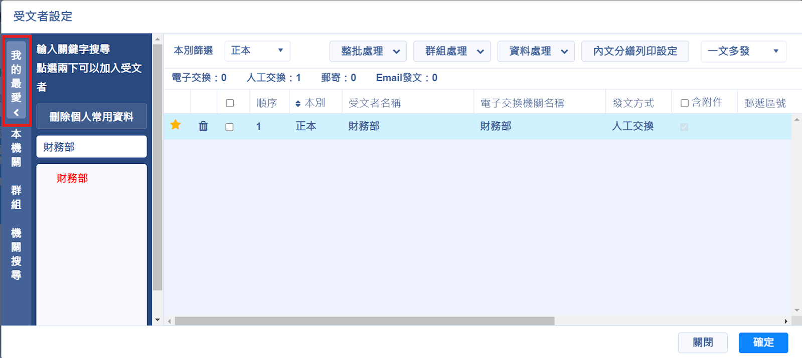 受文者列表的每一個受文者左邊都會有一個【星星】,點下去就加入常用受文者(我的最愛)了。